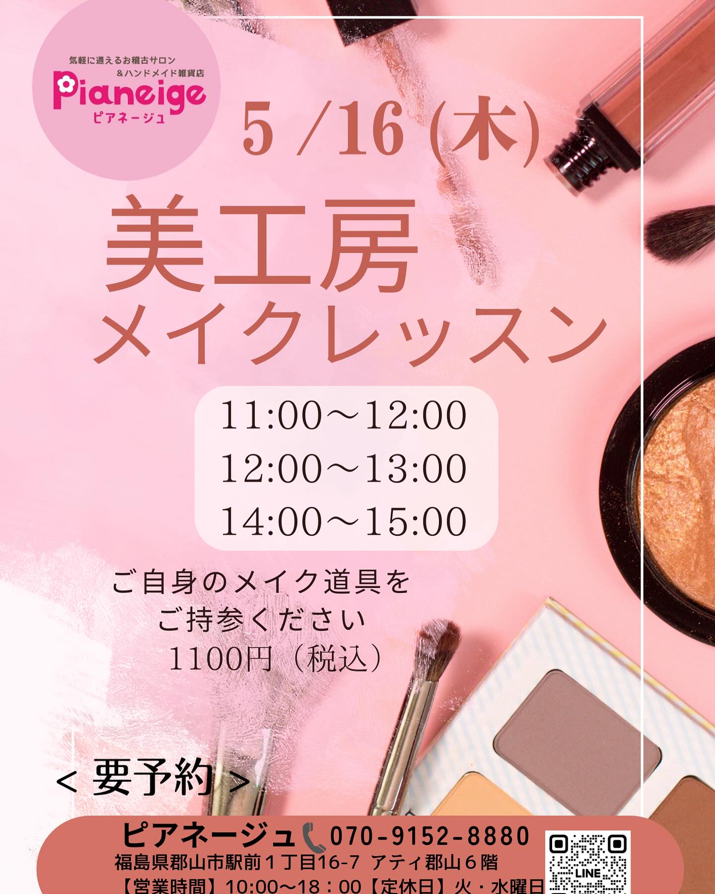 ︎メイクレッスン 1100円(税込) @moe.e.maman 5/16(木) 〈予約〉 11:00~12:00 12:00~13:00 14:00~15:00 ご自身のメイク道具をご持参下さい お持ちの物を利用し 似合うメイクを覚えませんか 足りないメイク道具はこちらでも ご用意しますのでご心配なく️ エステシャン経験20年の先生に メイクの事やお肌の事を相談できる チャンスです 入学、入社この機会にぜひ 自分にあったメイクを覚えましょう❣️ 〒963-8002 福島県郡山市駅前1丁目16-7 ATi郡山6階 Pianeigeピアネージュ 営業時間10~18時(火水は定休日) 予約電話 070-9152-8880