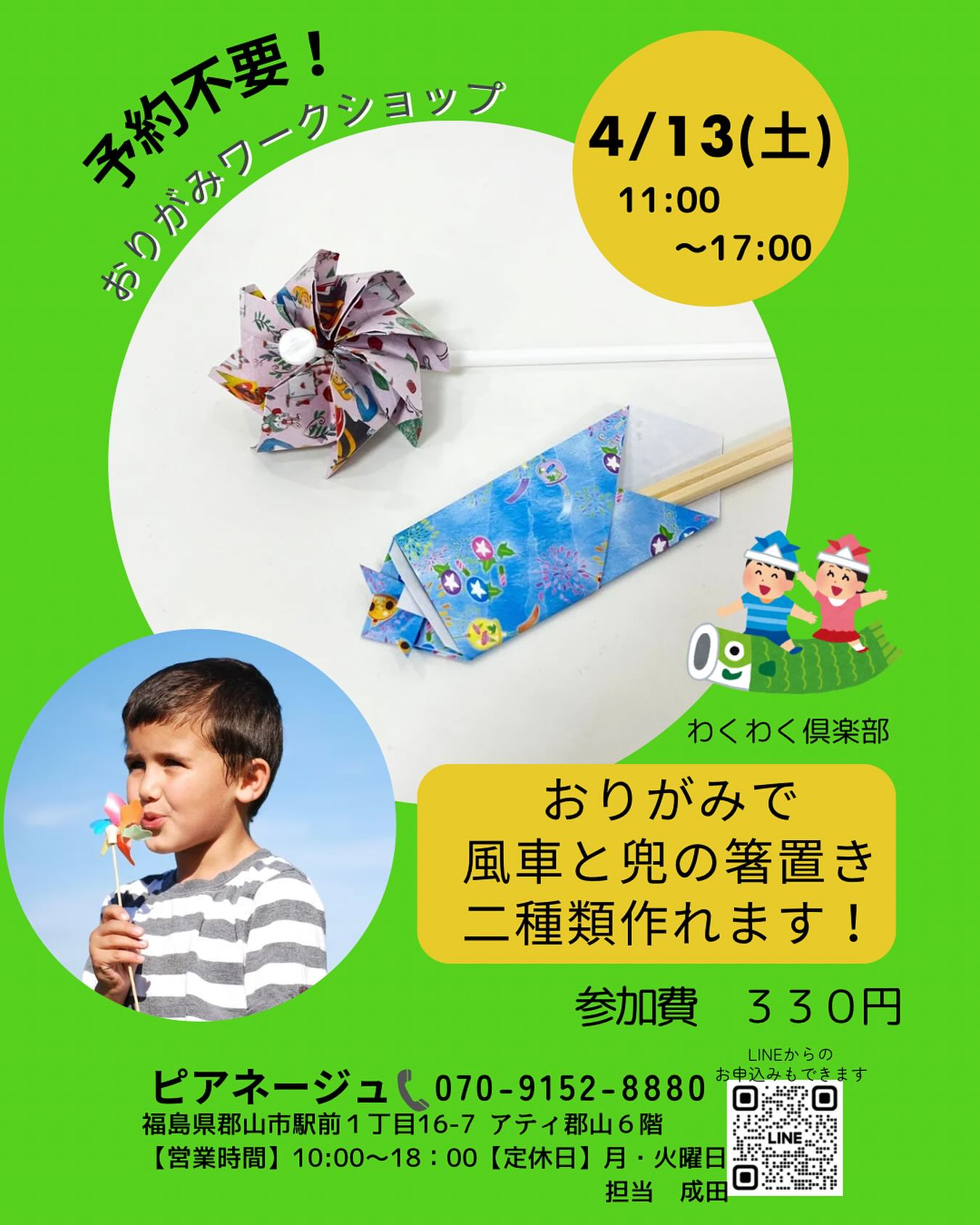 【ワークショップ情報】 おりがみワークショップ 4/13(土)11:00~17:00 参加費 330円 『風車』と『兜の箸袋』の2種類を 折って頂く事が出来ます 子供の日の飾り用にもいかがでしょうか? 予約不要ですので 直接売場にお越しください 〒963-8002 福島県郡山市駅前1丁目16-7 ATi郡山6階 Pianeigeピアネージュ 営業時間10~18時(月火は定休日) 予約電話 070-9152-8880