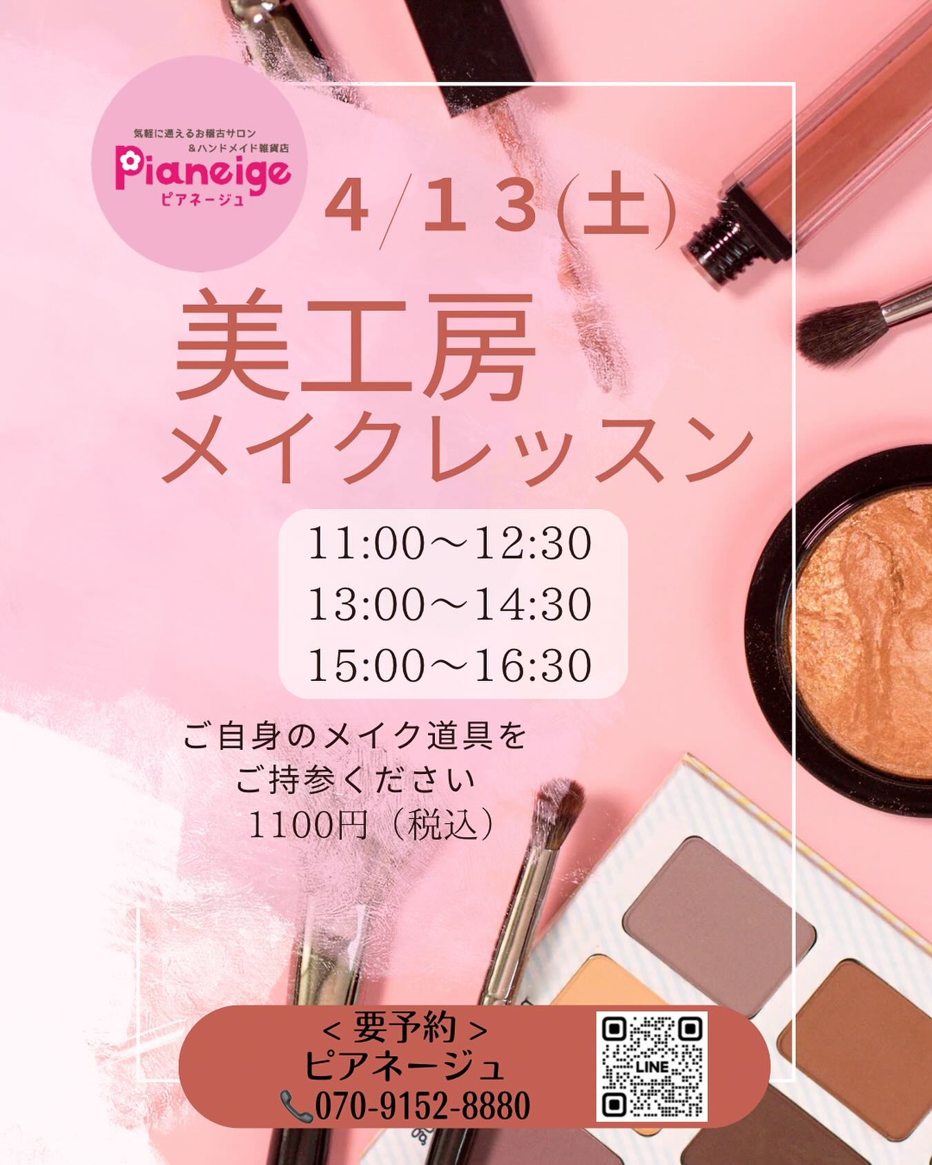 メイクレッスン @moe.e.maman 4/13(土) 〈予約〉 11:00~12:30 13:00~14:30 15:00~16:30 1100円(税込) ご自身のメイク道具をご持参下さい お持ちの物を利用し 似合うメイクを覚えませんか 足りないメイク道具はこちらでも ご用意しますのでご心配なく️ エステシャン経験20年の先生に メイクの事やお肌の事を相談できる チャンスです 入学、入社この機会にぜひ 自分にあったメイクを覚えましょう❣️ 〒963-8002 福島県郡山市駅前1丁目16-7 ATi郡山6階 Pianeigeピアネージュ 営業時間10~18時(月火は定休日) 予約電話 070-9152-8880