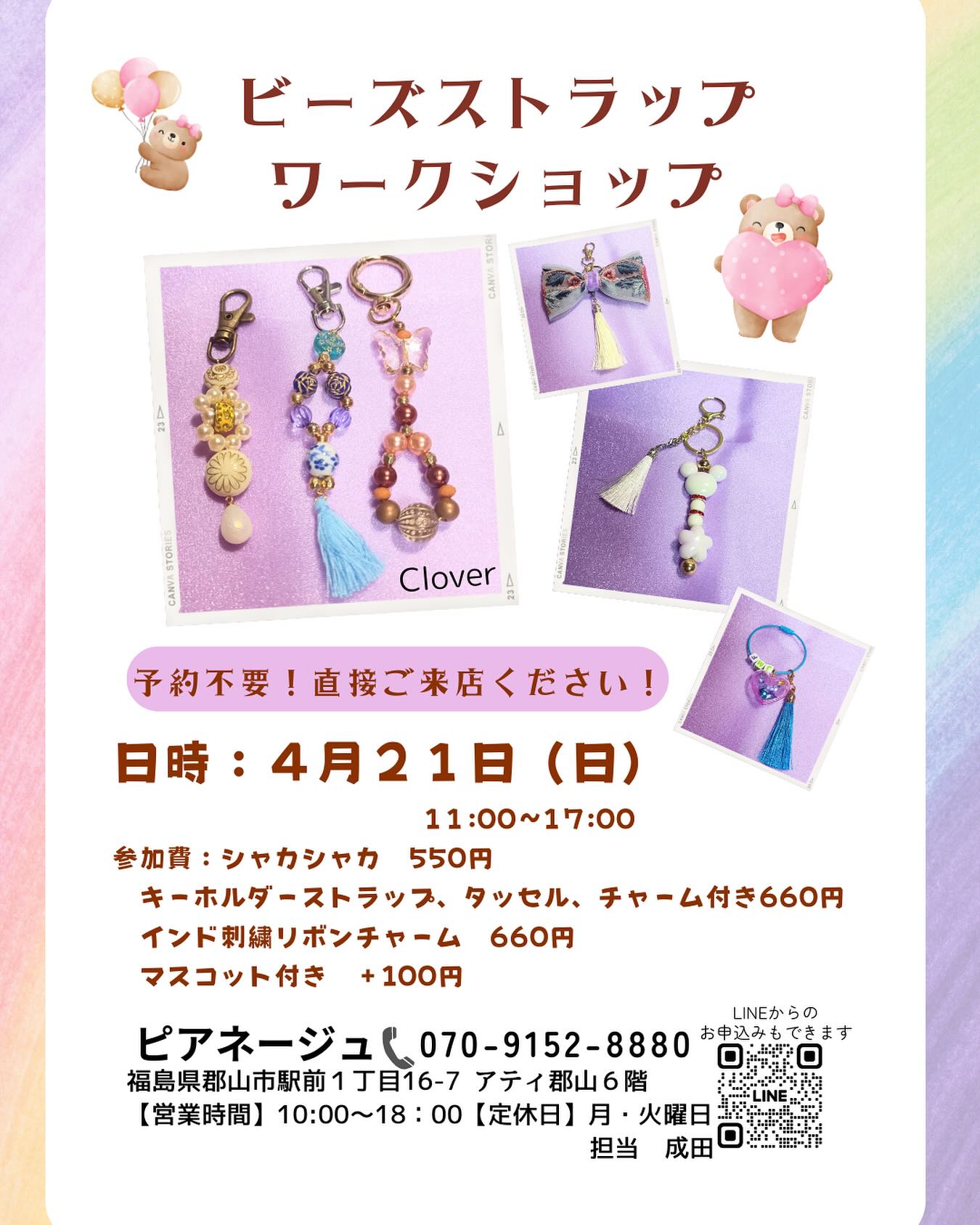 【ワークショップ情報】 @clover_hiromi ビーズストラップのワークショップ 4/21(日) 11:00~17:00 参加費550円~ 色々なデザインがありますので お好みの物をお選びください 予約不要です 直接、お店にお越しくださいませ 〒963-8002 福島県郡山市駅前1丁目16-7 ATi郡山6階 Pianeigeピアネージュ 営業時間10~18時(月火は定休日) 予約電話 070-9152-8880