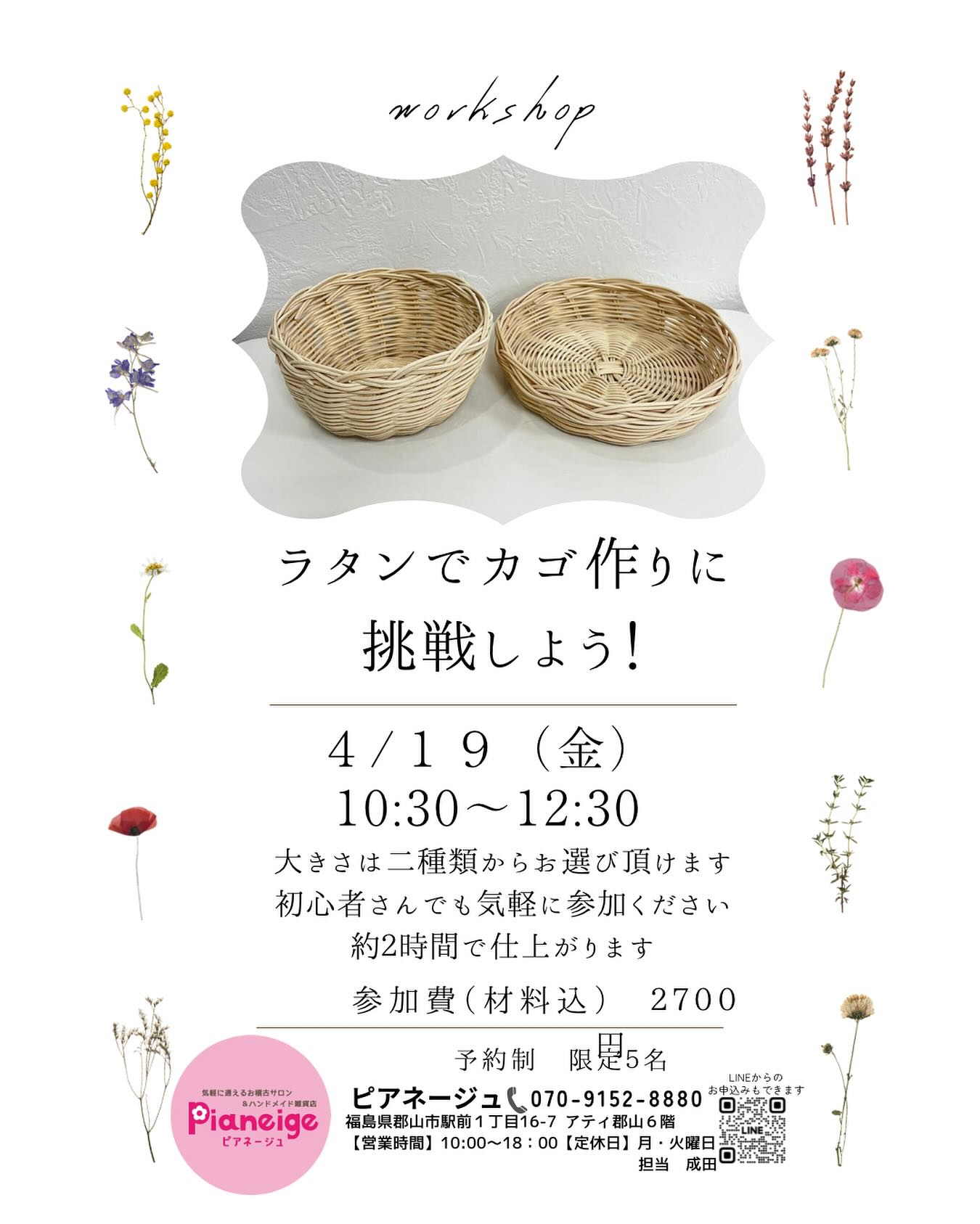 【ワークショップ情報】 ラタンでカゴ作りに挑戦しよう! @tehutehuk 4/19(金)10:30〜12:30 大きさは二種類から選んでいただけます 初心者さんでも気軽に参加ください 約2時間で仕上がります 参加費(材料込)2700円 限定5組!ご予約はお早めに! 〒963-8002 福島県郡山市駅前1丁目16-7 ATi郡山6階 Pianeigeピアネージュ 営業時間10~18時(月火は定休日) 予約電話 070-9152-8880