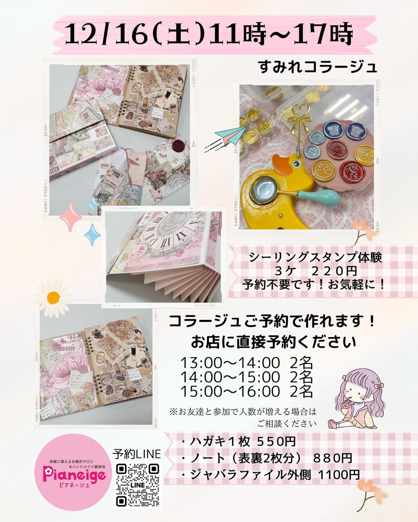 【ワークショップ情報】 12/16(土)11:00~17:00 作家さまによる ワークショップがあります❣️ シーリングスタンプ 〈予約不要〉 3ケ220円 ワックスを選んで、 ワックスが溶けるのを眺めて 可愛いスタンプ一緒に作りましょう❣️ コラージュ 〈予約下さい〉 ハガキ1枚550円 ノート(表裏2枚分)880円 ジャバラファイル外側1100円 13:00~ 14:00~ 15:00~ 予約可能です ぜひこの機会にコラージュ 体験ください お気軽にDMでお問い合わせ お待ちしております ..𖥧 𖧧 ˒˒. 𖡼.𖤣𖥧 ⠜ . .𖥧 𖥧 𖧧 ˒˒. 𖡼.𖤣𖥧 ⠜ 新規オーナーさまも大募集中です ..𖥧 𖧧 ˒˒. 𖡼.𖤣𖥧 ⠜ . .𖥧 𖥧 𖧧 ˒˒. 𖡼.𖤣𖥧 ⠜ いいね️フォローを いただけますと、 大変励みになります。 〒963-8002 福島県郡山市駅前1丁目16-7 ATi郡山6階 Pianeige️ピアネージュ 10~18時(月火は定休日) ..𖥧 𖧧 ˒˒. 𖡼.𖤣𖥧 ⠜ . .𖥧 𖥧 𖧧 ˒˒. 𖡼.𖤣𖥧 ⠜ #福島県 #郡山市 #pianeige #ピアネージュ #ピアネージュ郡山 #アティ郡山 #Ati郡山 #ハンドメイド #委託販売 #レンタルボックス #雑貨屋 #郡山雑貨屋 #レンタルスペース