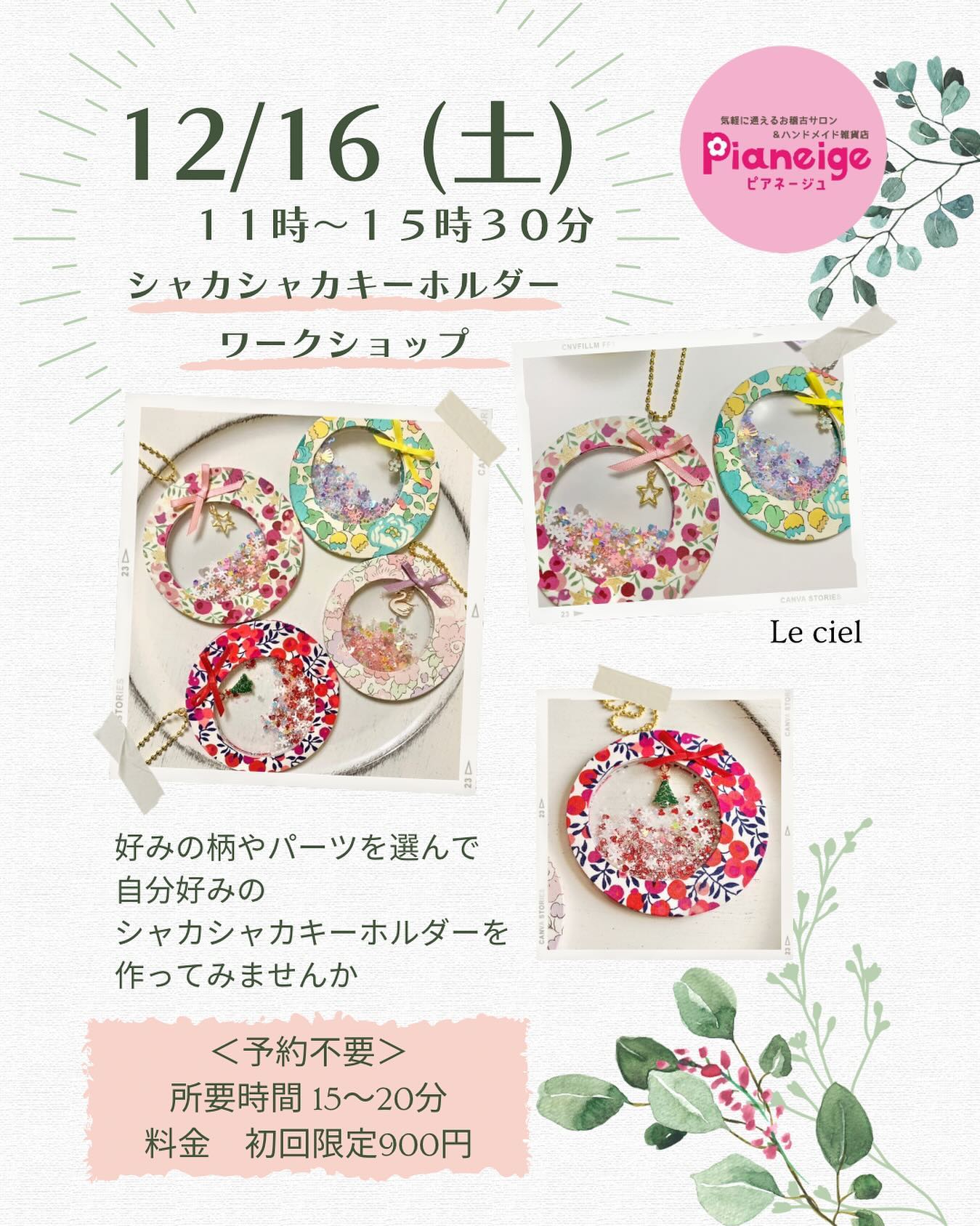 【ワークショップ情報】 @ami_maaru 12/16(日)11:00~15:30 作家さまによる ワークショップがあります❣️ シャカシャカキーホルダーは 〈予約不要〉でお作り頂けます❣️ リボンやビーズ、 チャームなど オリジナルチャームを作りましょう お得な初回にぜひ作りにいらして下さい 初回限定900円 お気軽にDMでお問い合わせ お待ちしております ..𖥧 𖧧 ˒˒. 𖡼.𖤣𖥧 ⠜ . .𖥧 𖥧 𖧧 ˒˒. 𖡼.𖤣𖥧 ⠜ 新規オーナーさまも大募集中です ..𖥧 𖧧 ˒˒. 𖡼.𖤣𖥧 ⠜ . .𖥧 𖥧 𖧧 ˒˒. 𖡼.𖤣𖥧 ⠜ いいね️フォローを いただけますと、 大変励みになります。 〒963-8002 福島県郡山市駅前1丁目16-7 ATi郡山6階 Pianeige️ピアネージュ 10~18時(月火は定休日) ..𖥧 𖧧 ˒˒. 𖡼.𖤣𖥧 ⠜ . .𖥧 𖥧 𖧧 ˒˒. 𖡼.𖤣𖥧 ⠜ #福島県 #郡山市 #pianeige #ピアネージュ #ピアネージュ郡山 #アティ郡山 #Ati郡山 #ハンドメイド #委託販売 #レンタルボックス #雑貨屋 #郡山雑貨屋 #レンタルスペース