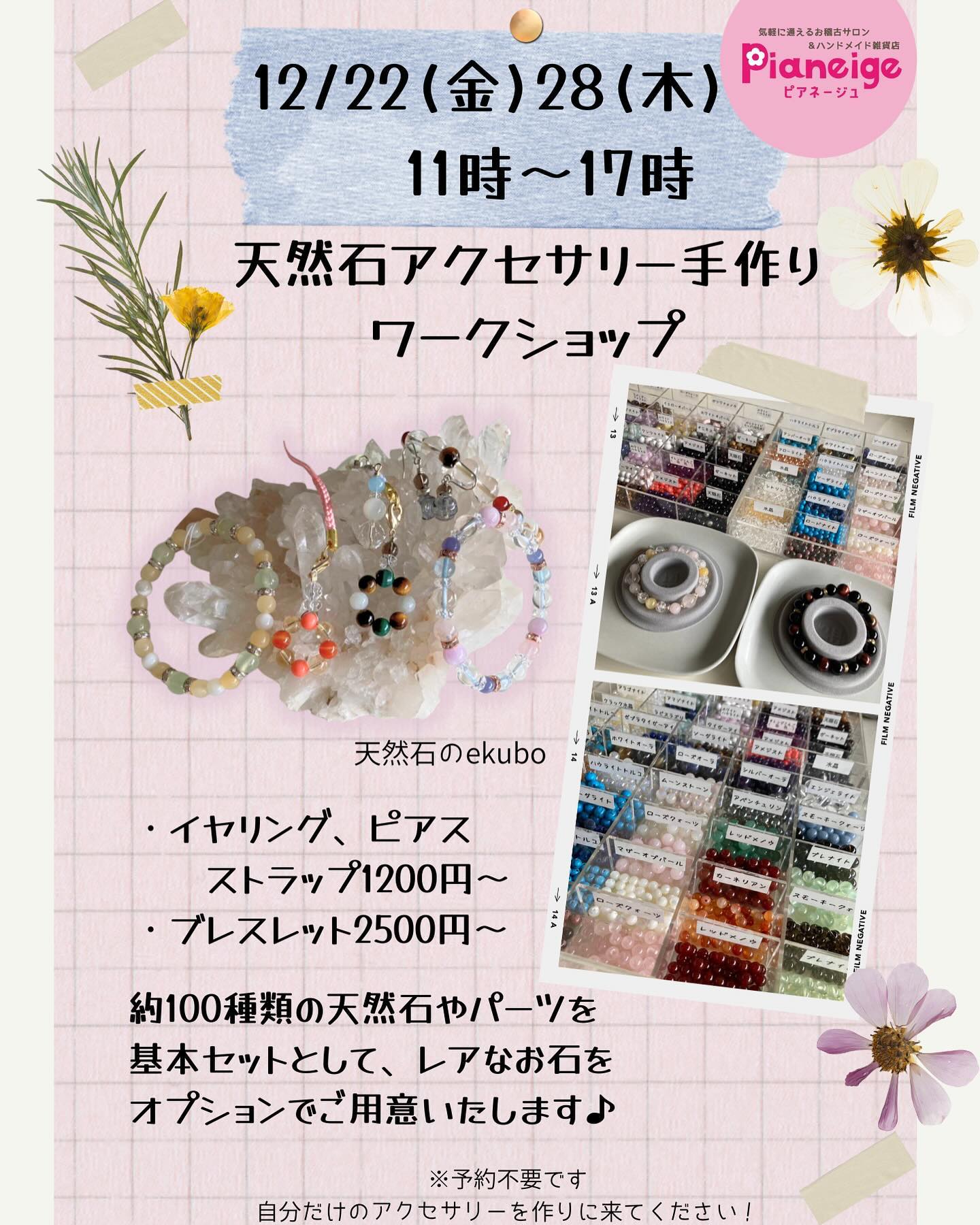 【ワークショップ情報】 @stone_ekubo 12/22(金)28(木)11:00~17:00 作家さまによる ワークショップがあります❣️ 天然石アクセサリー手作り ワークショップ 〈予約不要〉 イヤリング、ピアス、ストラップ 1200円~ ブレスレット 2500円~ 約100種類の天然石やパーツを 基本セットとして、 レアなお石をオプションで、 ご用意いたします ぜひこの機会にオリジナルの 天然石アクセサリーを 作りに来てください お気軽にDMでお問い合わせ お待ちしております ..𖥧 𖧧 ˒˒. 𖡼.𖤣𖥧 ⠜ . .𖥧 𖥧 𖧧 ˒˒. 𖡼.𖤣𖥧 ⠜ ワークショップして下さる 作家さま大募集中です ..𖥧 𖧧 ˒˒. 𖡼.𖤣𖥧 ⠜ . .𖥧 𖥧 𖧧 ˒˒. 𖡼.𖤣𖥧 ⠜ いいね️フォローを いただけますと、 大変励みになります。 〒963-8002 福島県郡山市駅前1丁目16-7 ATi郡山6階 Pianeigeピアネージュ 10~18時(月火は定休日) ..𖥧 𖧧 ˒˒. 𖡼.𖤣𖥧 ⠜ . .𖥧 𖥧 𖧧 ˒˒. 𖡼.𖤣𖥧 ⠜ #福島県 #郡山市 #pianeige #ピアネージュ #ピアネージュ郡山 #アティ郡山 #Ati郡山 #ハンドメイド #委託販売 #レンタルボックス #雑貨屋 #郡山雑貨屋 #レンタルスペース