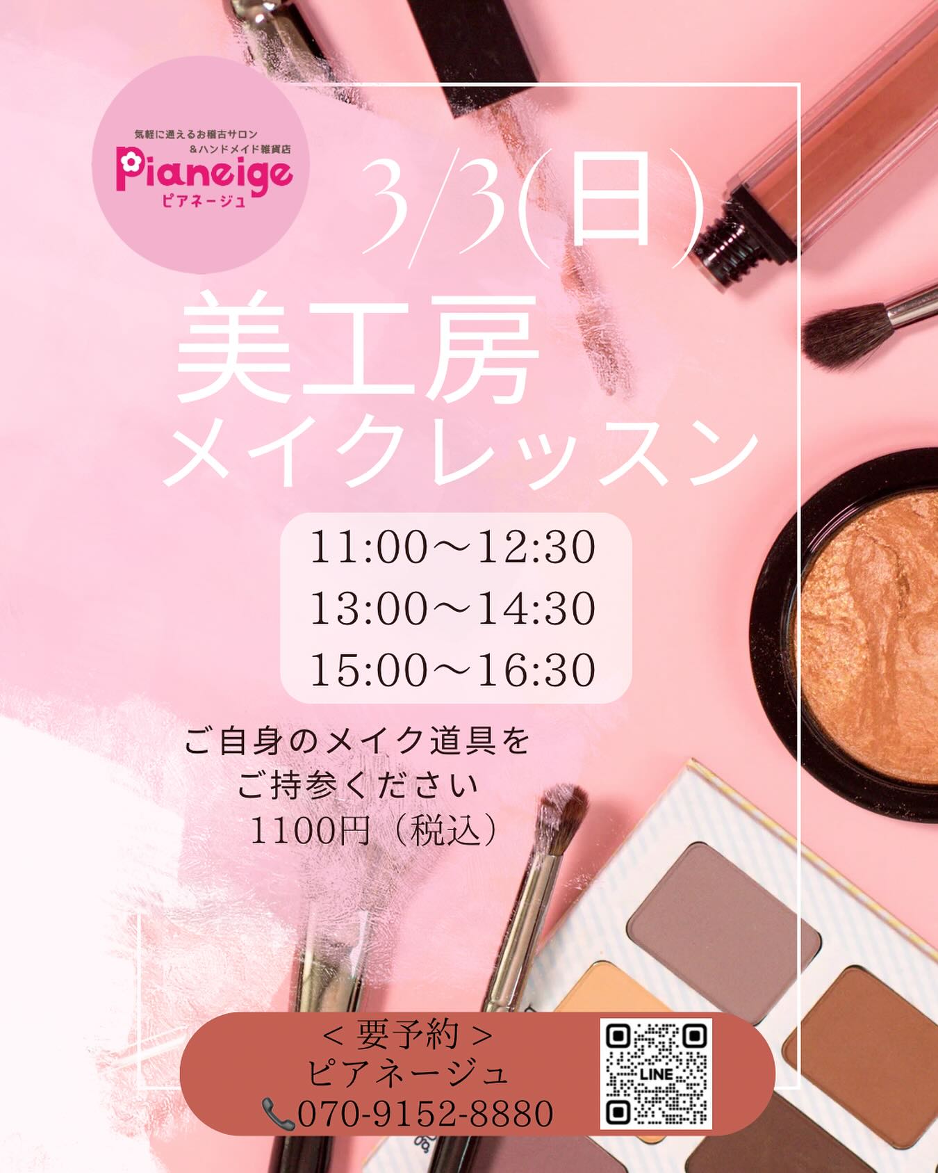 【ワークショップ情報】 @moe.e.maman 3/3(土)11:00~16:30 美工房さまによる メイクレッスンがあります❣️ メイクレッスン 1100円(税込) 〈予約〉 11:00~12:45 13:00~14:30 15:00~16:30 ご自身のメイク道具をご持参下さい お持ちの物を利用し 似合うメイクを覚えませんか 足りないメイク道具はこちらでも ご用意しますのでご心配なく️ エステシャン経験20年の先生に メイクの事やお肌の事を相談できる チャンスです 卒業、入学、入社この機会にぜひ 自分にあったメイクを覚えましょう❣️ お気軽にDMでお問い合わせ予約 お待ちしております ..𖥧 𖧧 ˒˒. 𖡼.𖤣𖥧 ⠜ . .𖥧 𖥧 𖧧 ˒˒. 𖡼.𖤣𖥧 ⠜ ワークショップして下さる 作家さま大募集中です ..𖥧 𖧧 ˒˒. 𖡼.𖤣𖥧 ⠜ . .𖥧 𖥧 𖧧 ˒˒. 𖡼.𖤣𖥧 ⠜ いいね️フォローを いただけますと、 大変励みになります。 〒963-8002 福島県郡山市駅前1丁目16-7 ATi郡山6階 Pianeigeピアネージュ 10~18時(月火は定休日) ..𖥧 𖧧 ˒˒. 𖡼.𖤣𖥧 ⠜ . .𖥧 𖥧 𖧧 ˒˒. 𖡼.𖤣𖥧 ⠜ #福島県 #郡山市 #pianeige #ピアネージュ #ピアネージュ郡山 #アティ郡山 #Ati郡山 #ハンドメイド #委託販売 #レンタルボックス #雑貨屋 #郡山雑貨屋 #レンタルスペース @atikoriyama @pinky_2019_