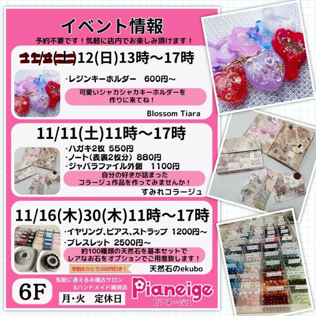訂正【11月】WS開催のお知らせ𓂃.·˖* 気軽に通えるお稽古サロン&ハンドメイド雑貨店 Pianeige️ピアネージュ です。 いつも当店を一緒に 盛り上げてくださりありがとうございます ..𖥧 𖧧 ˒˒. 𖡼.𖤣𖥧 ⠜ . .𖥧 𖥧 𖧧 ˒˒. 𖡼.𖤣𖥧 ⠜ 当店ボックスオーナーさまによる 11月ワークショップ開催のお知らせです(´︶`)♡ 2023年11月12日(日)13:00~17:00 Blossom Tira さま@blos_somtiara レジンキーホルダーws ※ご都合により11/4はとなりました。 2023年11月11日(土)11:00~17:00 すみれコラージュさま コラージュws 2023年11月16日(木)11:00~17:00 2023年11月30(木)11:00~17:00 天然石のekubo さま @stone_ekubo 天然石アクセサリーws ご予約なしでお作りいただけます。 この機会にぜひ、 お気軽にお立ち寄りくださいませ❣❣ ..𖥧 𖧧 ˒˒. 𖡼.𖤣𖥧 ⠜ . .𖥧 𖥧 𖧧 ˒˒. 𖡼.𖤣𖥧 ⠜ Pianeige️ピアネージュを一緒に盛り上げてくださるサポーターさんも大募集 ..𖥧 𖧧 ˒˒. 𖡼.𖤣𖥧 ⠜ . .𖥧 𖥧 𖧧 ˒˒. 𖡼.𖤣𖥧 ⠜ いいね️やコメント、 フォローをいただけますと、 大変励みになります。 〒963-8002 福島県郡山市駅前1丁目16-7 ATi郡山6階 Pianeige️ピアネージュ 10~18時(月火は定休日) ..𖥧 𖧧 ˒˒. 𖡼.𖤣𖥧 ⠜ . .𖥧 𖥧 𖧧 ˒˒. 𖡼.𖤣𖥧 ⠜ #福島県 #郡山市 #pianeige #ピアネージュ #ピアネージュ郡山 #アティ郡山 #Ati郡山 #ハンドメイド #お稽古サロン #委託販売 #レンタルボックス #雑貨屋 #郡山雑貨屋 #レンタルスペース 【運営スタッフ】 @pinky_2019_
