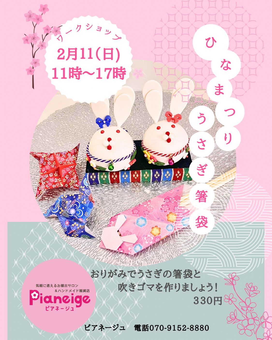 【ワークショップ情報】 2/11 (日)13:00~17:00 作家さまによる ワークショップがあります❣️ おりがみで作る うさぎの箸袋と吹きゴマ おひな様の時に絶対 うさぎの箸袋は可愛い❣️ 吹きゴマは大人も癖になるクルクル 自分で作って(〃´o`)フゥ…クルクル テンション上がります 箸袋と吹きゴマを作って 330円になります❣️ ぜひ一緒楽しみましょう お気軽にDMでお問い合わせ お待ちしております ..𖥧 𖧧 ˒˒. 𖡼.𖤣𖥧 ⠜ . .𖥧 𖥧 𖧧 ˒˒. 𖡼.𖤣𖥧 ⠜ ワークショップして下さる 作家さま大募集中です ..𖥧 𖧧 ˒˒. 𖡼.𖤣𖥧 ⠜ . .𖥧 𖥧 𖧧 ˒˒. 𖡼.𖤣𖥧 ⠜ いいね️フォローを いただけますと、 大変励みになります。 〒963-8002 福島県郡山市駅前1丁目16-7 ATi郡山6階 Pianeigeピアネージュ 10~18時(月火は定休日) ..𖥧 𖧧 ˒˒. 𖡼.𖤣𖥧 ⠜ . .𖥧 𖥧 𖧧 ˒˒. 𖡼.𖤣𖥧 ⠜ #福島県 #郡山市 #pianeige #ピアネージュ #ピアネージュ郡山 #アティ郡山 #Ati郡山 #ハンドメイド #委託販売 #レンタルボックス #雑貨屋 #郡山雑貨屋 #レンタルスペース @atikoriyama @pinky_2019_