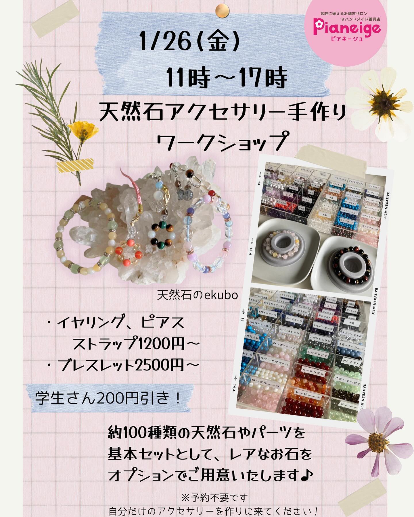 【ワークショップ情報】 @stone_ekubo 1/26(金)11:00~17:00 作家さまによる ワークショップがあります❣️ 天然石アクセサリーワークショップ 〈予約不要〉 イヤリング、ピアス、ストラップ 1200円〜 ブレスレット 2500円 学生さん200円引き! ぜひこの機会に オリジナルの天然石アクセサリーを 作ってみてください お気軽にDMでお問い合わせ お待ちしております ..𖥧 𖧧 ˒˒. 𖡼.𖤣𖥧 ⠜ . .𖥧 𖥧 𖧧 ˒˒. 𖡼.𖤣𖥧 ⠜ ワークショップして下さる 作家さま大募集中です ..𖥧 𖧧 ˒˒. 𖡼.𖤣𖥧 ⠜ . .𖥧 𖥧 𖧧 ˒˒. 𖡼.𖤣𖥧 ⠜ いいね️フォローを いただけますと、 大変励みになります。 〒963-8002 福島県郡山市駅前1丁目16-7 ATi郡山6階 Pianeigeピアネージュ 10~18時(月火は定休日) ..𖥧 𖧧 ˒˒. 𖡼.𖤣𖥧 ⠜ . .𖥧 𖥧 𖧧 ˒˒. 𖡼.𖤣𖥧 ⠜ #福島県 #郡山市 #pianeige #ピアネージュ #ピアネージュ郡山 #アティ郡山 #Ati郡山 #ハンドメイド #委託販売 #レンタルボックス #雑貨屋 #郡山雑貨屋 #レンタルスペース @atikoriyama