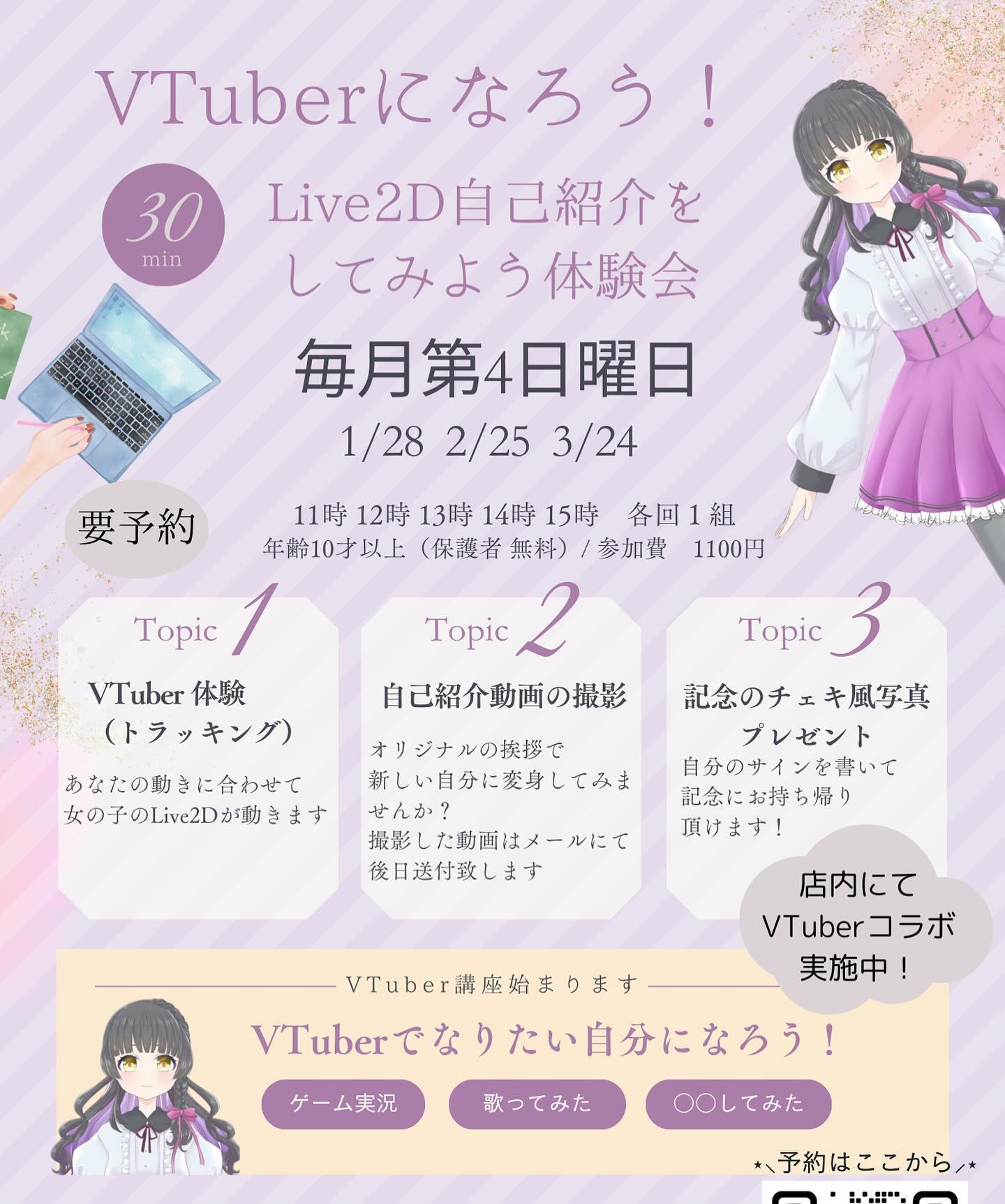 【VTuberになろう!】 Live2D自己紹介をしてみよう体験会 毎月第4日曜日 1/28 2/25 3/24 11時 12時 13時 14時 15時 各回1組 年齢10才以上(保護者 無料) 参加費/1100円 VTuber体験 自己紹介動画の撮影 記念のチェキ風写真プレゼント ぜひこの機会に体験ください お気軽にDMでお問い合わせ お待ちしております ..𖥧 𖧧 ˒˒. 𖡼.𖤣𖥧 ⠜ . .𖥧 𖥧 𖧧 ˒˒. 𖡼.𖤣𖥧 ⠜ ワークショップして下さる 作家さま大募集中です ..𖥧 𖧧 ˒˒. 𖡼.𖤣𖥧 ⠜ . .𖥧 𖥧 𖧧 ˒˒. 𖡼.𖤣𖥧 ⠜ いいね️フォローを いただけますと、 大変励みになります。 〒963-8002 福島県郡山市駅前1丁目16-7 ATi郡山6階 Pianeigeピアネージュ 10~18時(月火は定休日) ..𖥧 𖧧 ˒˒. 𖡼.𖤣𖥧 ⠜ . .𖥧 𖥧 𖧧 ˒˒. 𖡼.𖤣𖥧 ⠜ #福島県 #郡山市 #pianeige #ピアネージュ #ピアネージュ郡山 #アティ郡山 #Ati郡山 #ハンドメイド #委託販売 #レンタルボックス #雑貨屋 #郡山雑貨屋 #レンタルスペース @atikoriyama