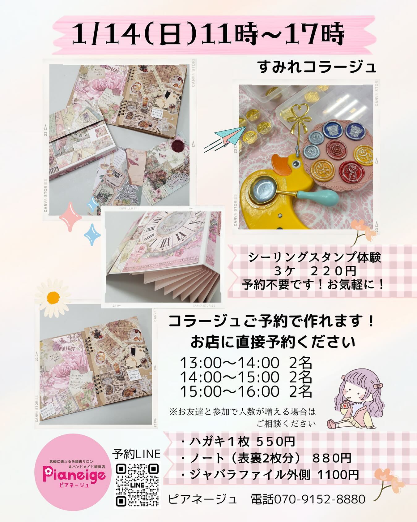 【ワークショップ情報】 1/14(日)11:00~17:00 作家さまによる ワークショップがあります❣️ シーリングスタンプ 〈予約不要〉 3ケ220円 ワックスを選んで、 ワックスが溶けるのを眺めて 可愛いスタンプ一緒に作りましょう❣️ コラージュ 〈予約下さい〉 ハガキ1枚550円 ノート(表裏2枚分)880円 ジャバラファイル外側1100円 13:00~ 14:00~ 15:00~ 予約可能です ぜひこの機会にコラージュ 体験ください お気軽にDMでお問い合わせ お待ちしております ..𖥧 𖧧 ˒˒. 𖡼.𖤣𖥧 ⠜ . .𖥧 𖥧 𖧧 ˒˒. 𖡼.𖤣𖥧 ⠜ 新規オーナーさまも大募集中です ..𖥧 𖧧 ˒˒. 𖡼.𖤣𖥧 ⠜ . .𖥧 𖥧 𖧧 ˒˒. 𖡼.𖤣𖥧 ⠜ いいね️フォローを いただけますと、 大変励みになります。 〒963-8002 福島県郡山市駅前1丁目16-7 ATi郡山6階 Pianeige ピアネージュ 10~18時(月火は定休日) ..𖥧 𖧧 ˒˒. 𖡼.𖤣𖥧 ⠜ . .𖥧 𖥧 𖧧 ˒˒. 𖡼.𖤣𖥧 ⠜ #福島県 #郡山市 #pianeige #ピアネージュ #ピアネージュ郡山 #アティ郡山 #Ati郡山 #ハンドメイド #委託販売 #レンタルボックス #雑貨屋 #郡山雑貨屋 #レンタルスペース @atikoriyama @pinky_2019_