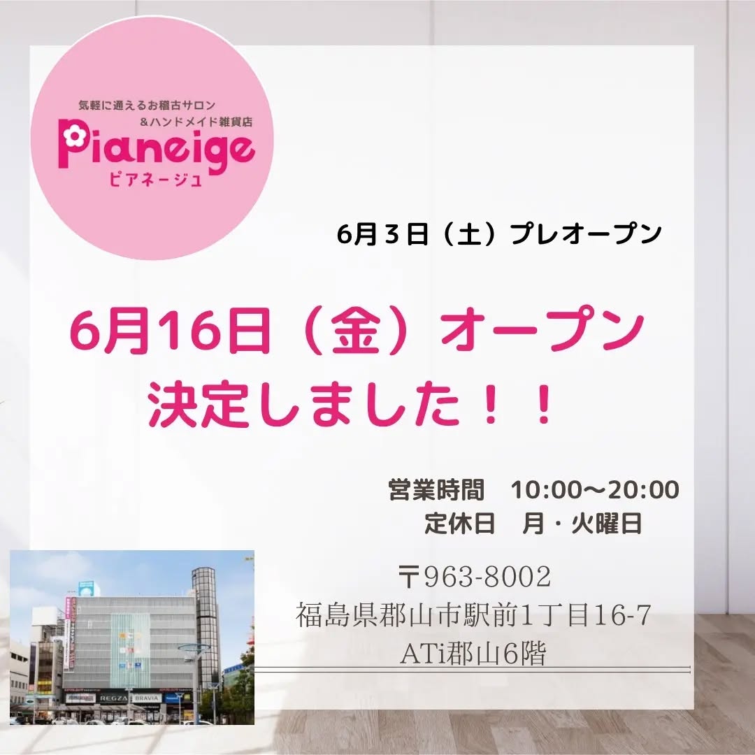 【オープンday決定】𓂃.·˖* 気軽に通えるお稽古サロン&ハンドメイド雑貨店 Pianeige️ピアネージュ です。 アティ郡山6階!! 2023/6/3(土)Pre Open!! 2023/6/16(金)Grand Open!! ただ今、開店に向け フル稼働で準備中です❣️ 明日11日から、 ハンドメイド作品を 委託していただける作家さまの 【先行予約】がスタートいたします❣️ 5月先行予約は、お得がイッパイ!! たくさんのご応募を、 お待ちしております❥❥❥⸜(ू•◡•)໒꒱ ..𖥧 𖧧 ˒˒. 𖡼.𖤣𖥧 ⠜ . .𖥧 𖥧 𖧧 ˒˒. 𖡼.𖤣𖥧 ⠜ いいね️やコメント、 フォローをしていただけますと、励みになります。 〒963-8002 福島県郡山市駅前1丁目16-7 ATi郡山6階 Pianeige️ピアネージュ ..𖥧 𖧧 ˒˒. 𖡼.𖤣𖥧 ⠜ . .𖥧 𖥧 𖧧 ˒˒. 𖡼.𖤣𖥧 ⠜ #福島県 #郡山市 #pianeige #ピアネージュ #アティ郡山 #Ati郡山 #ハンドメイド #お稽古サロン #委託販売 #レンタルボックス #雑貨屋 #郡山雑貨屋 @pinky_2019_ @mon_ange.info