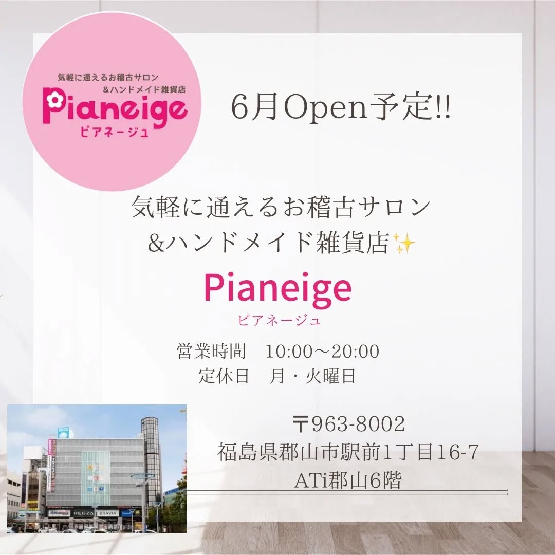 【初投稿】 気軽に通えるお稽古サロン&ハンドメイド雑貨店 Pianeige/ピアネージュ アティ郡山6階に6月Open予定です!! ハンドメイド好きさんが集える お店作りを目指し、 各種レッスンおよび、 作家さんの作品をレンタルボックス形式で 委託販売させていただきます。 いいね️やフォローをしていただけますと、 とても励みになります。 今後ともよろしくお願いします。 〒963-8002 福島県郡山市駅前1丁目16-7 ATi郡山6階 Pianeige/ピアネージュ ..𖥧 𖧧 ˒˒. 𖡼.𖤣𖥧 ⠜ . .𖥧 𖥧 𖧧 ˒˒. 𖡼.𖤣𖥧 ⠜ #福島県 #郡山市 #pianeige #ピアネージュ #アティ郡山 #Ati郡山 #ハンドメイド #お稽古サロン #委託販売 #レンタルボックス