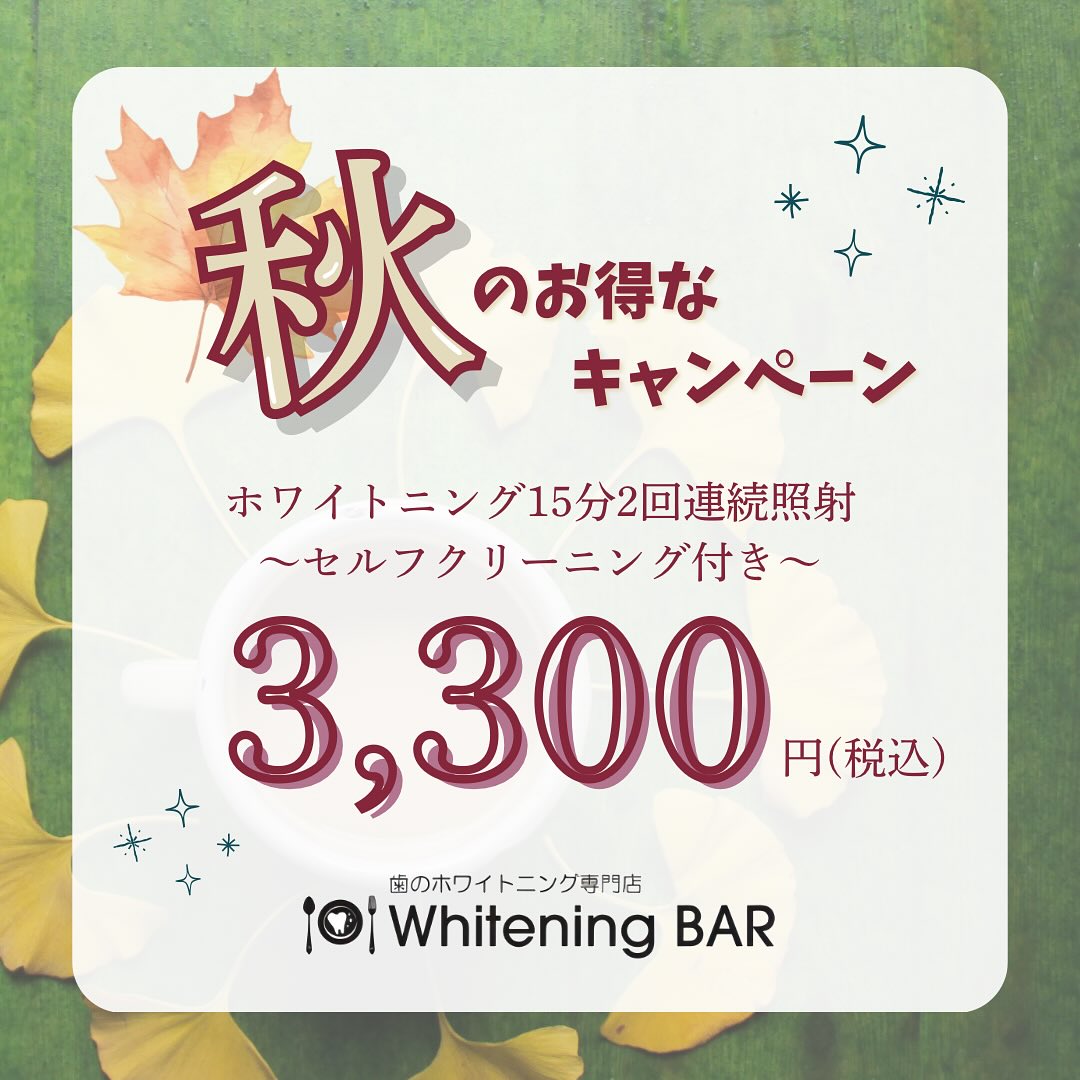 ︎ 秋のお得なキャンペーン 先着15名様限定️ ホワイトニング15分×2回連続照射 +セルフクリーニング付き 3,300円(税込) ホワイトニング前にセルフクリーニングでしっかりケア🪥 より効果を実感できるスペシャルプランです ご予約はお早めに #郡山ホワイトニング #セルフホワイトニング #秋限定キャンペーン #美歯ケア #ホワイトニングバー