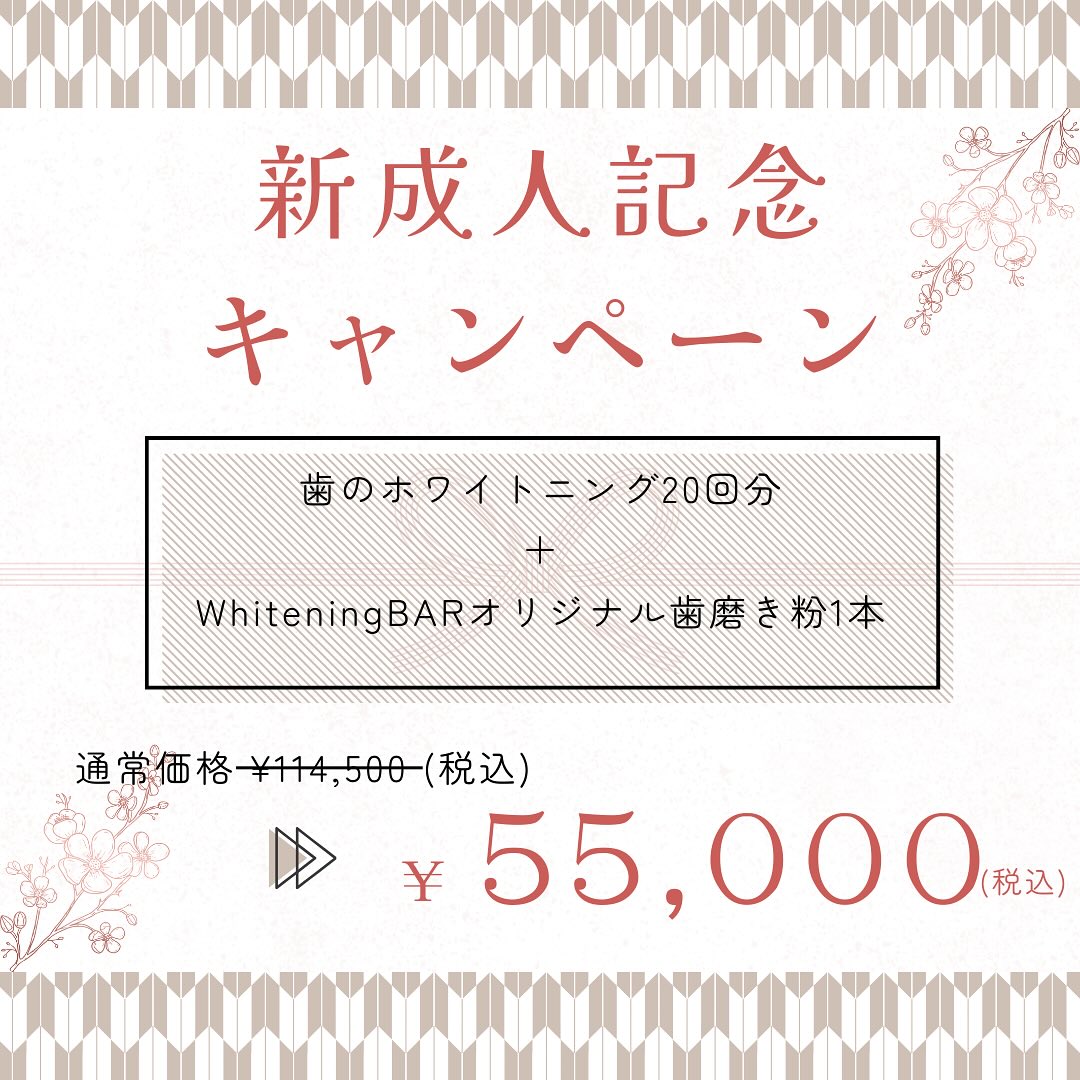 ︎ 成人式キャンペーン 来年成人式を迎える方限定 🦷20分照射×20回分 🦷WhiteningBARオリジナル歯磨き粉1本付き 総額104,400円 → 特別価格 50,000円 「まだ半年あるし早くない?」と思う方も多いですが…実は全然早くないんです♀️ 成人式直前や1〜2週間前では間に合わないことがほとんど 今からしっかりケアを始めて、 一生に一度の大切な日を“真っ白な歯”で迎えましょう 対象は成人式を迎える方限定です🤍 ご予約・ご来店お待ちしております🫶🏻 #ホワイトニング #成人式 #郡山ホワイトニング #WhiteningBAR #ホワイトニングバーアティ郡山店 #成人式準備 #歯の美容 #郡山美容