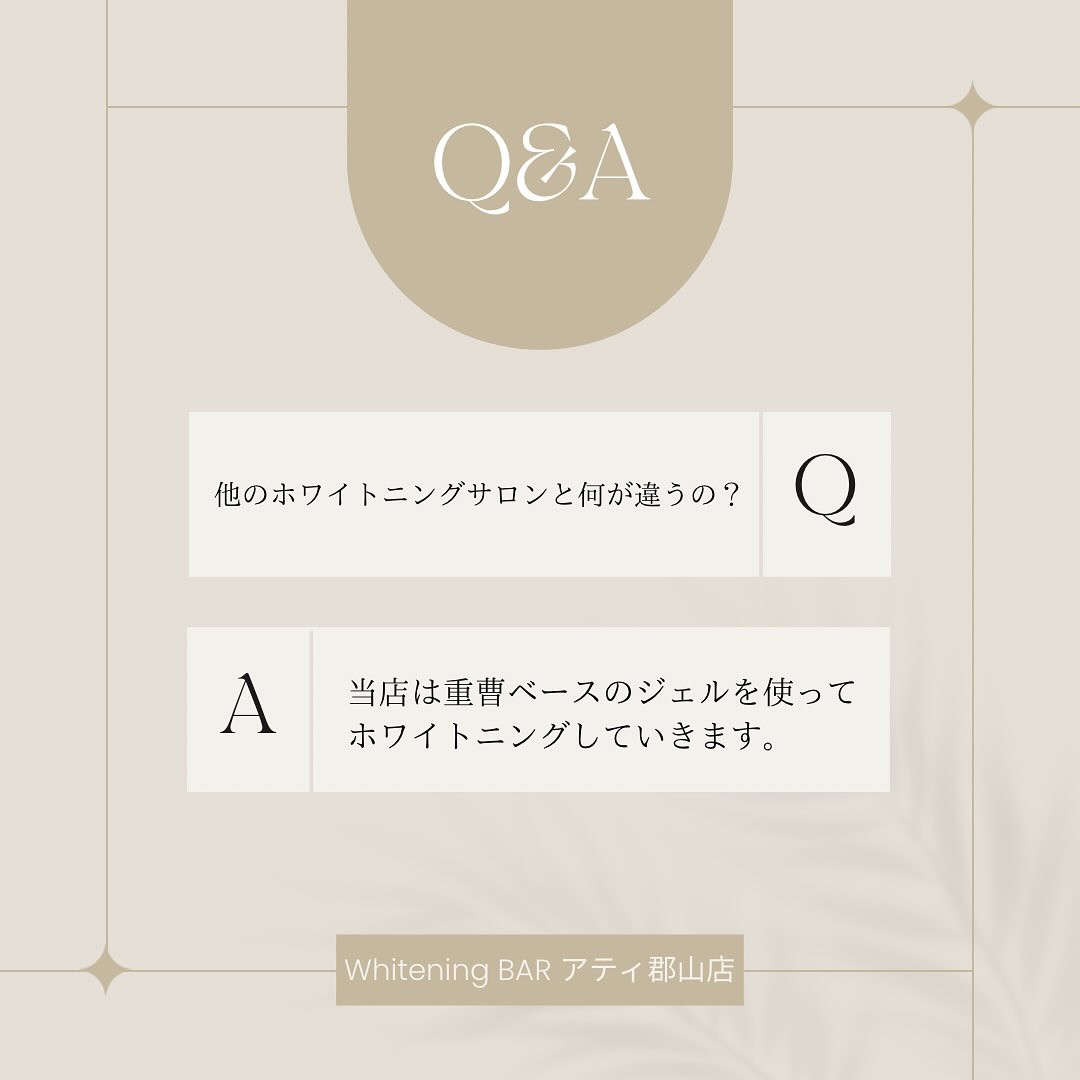 ︎ こんにちは!ホワイトニングバーアティ郡山店です 本日は、お客様からよくいただくご質問 「他のセルフホワイトニングと何が違うの?」についてお答えします️ 一番の違いは、ホワイトニングに使用する【ジェル】にあります 実はセルフホワイトニングで使用するLEDライトは、どこもほとんど同じ。 ホワイトニングの効果を左右する一番のポイントは、ジェルの性能なんです🙂️ 照射時間をただ長くしても効果が変わるわけではありません “LED照射 × ジェルの性能”の掛け合わせが、白さを生み出します!🦷 他店で効果を実感できなかった方も、ぜひ一度当店のホワイトニングを体験してみてください🦷 「今までと全然違う!」そんな声、たくさんいただいています️ 効果に自信があります🏻 #ホワイトニングバーアティ郡山店 #郡山セルフホワイトニング #郡山ホワイトニング #福島ホワイトニング #セルフホワイトニング専門店 #歯の美容サロン #他と違うホワイトニング #ジェルが違う #効果重視ホワイトニング #白さ実感 #ホワイトニング効果抜群 #LEDだけじゃない #ジェルの力 #照射時間じゃない