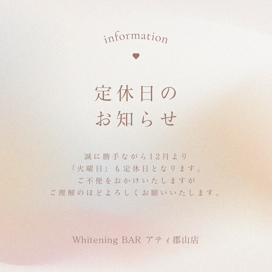 ︎ 【大切なお知らせ】 こんにちは、ホワイトニングバーアティ郡山店です🦷 いつも当店をご利用いただきありがとうございます。 この度、来月より定休日を「木曜日」に加えて「火曜日」も設けることになりました。 より質の高いサービス提供のための体制づくりとしての変更となります。 ご不便をおかけいたしますが、ご理解いただけますと幸いです。 これからも皆さまに明るい笑顔をご提供できるよう努めてまいります 今後ともホワイトニングバーアティ郡山店をよろしくお願いいたします。