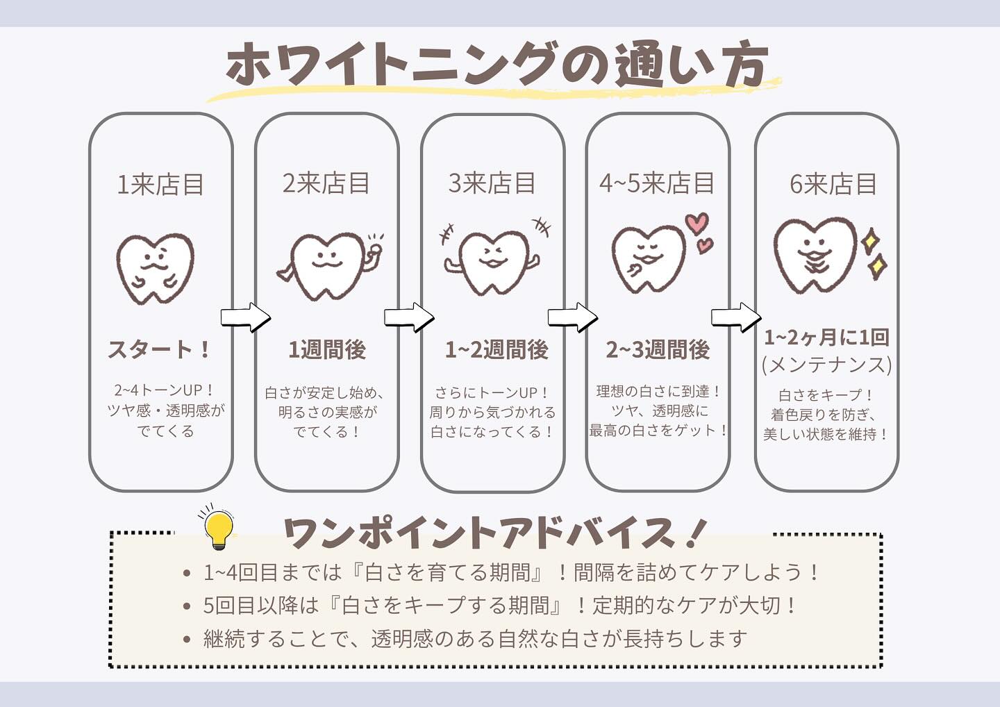 ︎ 🦷ホワイトニングの通い方ガイド 「どのくらいのペースで通えばいいの?」 そんな方に向けて、理想の白さまでのステップをまとめました🤍 1〜4回目までは“白さを育てる期間” 間隔をあけすぎずに通うのがポイント! 5回目以降は“白さをキープする期間” 定期的なケアでツヤ感・透明感を長持ちさせましょう 理想の白さを叶えて、笑顔に自信を🤍 #ホワイトニングバー #セルフホワイトニング #歯の美容 #郡山ホワイトニング #歯を白く