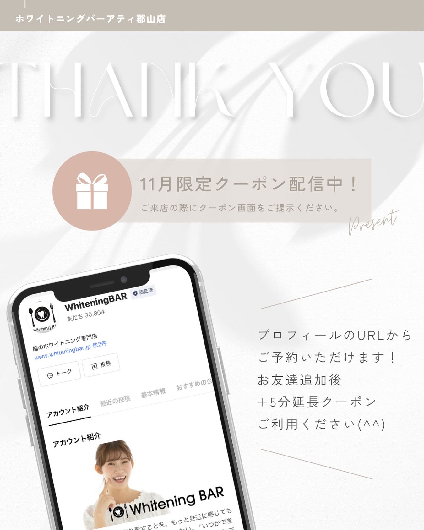 ︎︎ ︎︎ 🦷ホワイトニングバーからお得なお知らせ🦷 いつもご覧いただきありがとうございます️ 実は…WhiteningBAR公式LINEをお友だち追加してくださった方限定で 【照射時間5分延長クーポン】をプレゼント中です! 通常よりも照射時間が長くなることで 白さの定着やトーンアップをさらに実感していただけます🤍 LINEではそのほかにも、 ️お得なキャンペーン情報 ️簡単予約 ️ご来店時に使えるクーポン など 限定配信しています この機会にぜひ、公式LINEをお友だち追加してみてください お得にホワイトニングケアを続けましょう🪄 #ホワイトニング #セルフホワイトニング #ホワイトニング福島 #ホワイトニング郡山 #アティ郡山 #歯のホワイトニング #ホワイトニングサロン #ホワイトニングバー #whiteningbar #白い歯 #痛くないホワイトニング #郡山市 #郡山駅 #郡山駅周辺 #美容 #自分磨き #メンズにも人気 #歯磨き粉 #ブライダル #カップル #友達同士 #当日予約OK #キャンペーン #リーズナブル #格安クーポン #施術効果 #施術写真