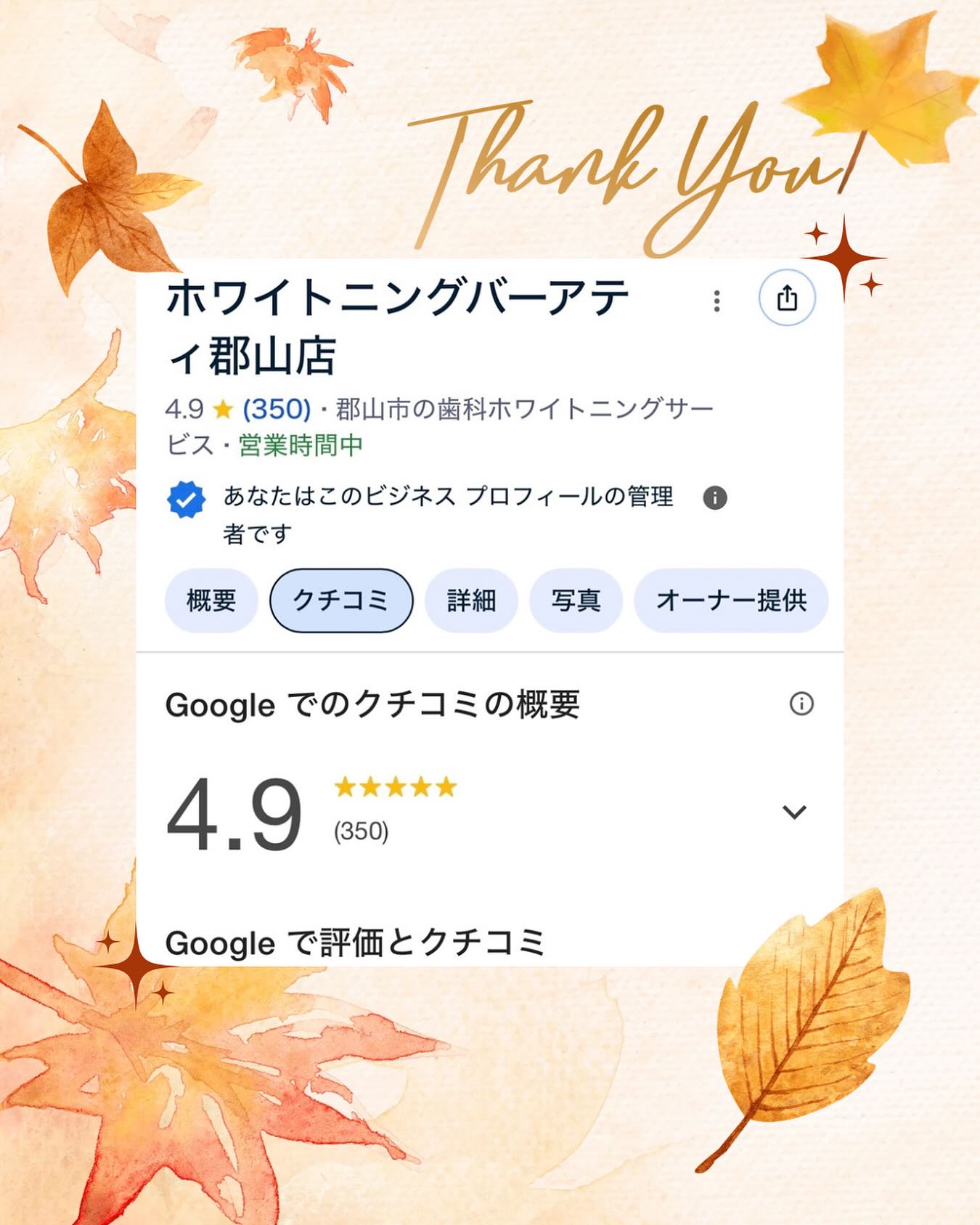 ︎︎ ︎︎ いつもWhitening BAR アティ郡山店をご利用いただき、誠にありがとうございます🦷 この度、Googleクチコミが【350件】を突破いたしました! たくさんのお客様にお越しいただき、 「初めてでも安心できた」「1回でトーンアップを実感した」など 嬉しいお声をたくさんいただいております️♪ 当店では、セルフホワイトニングが初めての方でも安心して通えるよう、スタッフが丁寧にサポートしながら、効果にこだわったケアをご提供しています🪄 歯が白くなると、笑顔や印象までパッと明るく 「写真を撮るのが楽しみになった!」というお声も多くいただいています📸 まだホワイトニングを試したことがない方も ぜひこの機会に体験してみてください🦷🤍 皆さまのご来店を心よりお待ちしております! ——————————————— ——————————————— ホワイトニングバー アティ郡山店 〒963-8002 福島県郡山市駅前1丁目16-7 アティ郡山6階 024-954-5656 営業時間:10:00〜20:00 ——————————————— ——————————————— 白い歯は第一印象をぐっと引き上げます🪞 「痛くない」「リーズナブル」「当日予約OK」で通いやすさも人気の理由 お友達やカップルでの来店も大歓迎です👭 ⸻ #ホワイトニング #セルフホワイトニング #ホワイトニング福島 #ホワイトニング郡山 #アティ郡山 #歯のホワイトニング #ホワイトニングサロン #ホワイトニングバー #whiteningbar #白い歯 #痛くないホワイトニング #郡山市 #郡山駅 #郡山駅周辺 #美容 #自分磨き #メンズにも人気 #ブライダル #カップル #友達同士 #当日予約OK #キャンペーン #リーズナブル #格安クーポン #施術効果 #施術写真
