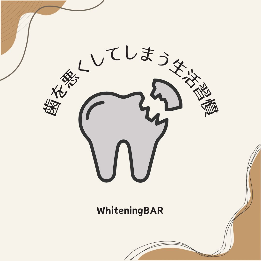 ︎ こんにちは! WhiteningBARアティ郡山店です🦷🤍 今回は歯を悪くしてしまう生活習慣についてです! ・タバコを吸う →タバコには多くの化学物質が含まれており、お口の中に対しての影響も多くあります。 歯が黄ばんでしまったり、歯病にもなりやすくなり、進行しやすくなります…。 ・間食をよくする →食事をとる回数が多いと歯に歯垢が溜まりやすくなるので、 虫歯や歯周病のリスクが高くなります。 ・柔らかいものばかり食べる →現代は、柔らかい加工食品が増えています。 柔らかい食べ物は噛む回数が減り、唾液の成分が減少しやすくなります。 ・酸性の物ばかりを摂取する →酸っぱいものや炭酸飲料は取りすぎると歯を溶かしてしまいます。 取りすぎには要注意です。 ・歯ぎしりをする →歯ぎしりは、無意識で強い力が加わります。 歯の表面がすり減ったり、歯を支えているあごの骨が溶けたりする事があります。 ・痛くないと歯医者にいかない →痛みや気になるところ出てきてからだと症状は少なからず進行してしまいます。 身体の健康診断と同じように歯も定期健診を受けましょう。 以上の事にてはまる事はありましたか? ひとつひとつ見直していき、お口の中の健康も守っていきましょう! 本日も皆様のご来店、心よりお待ちしております-`⋆ ——————————————— -—————————————— ホワイトニングバーアティ郡山店 〒963-8002 福島県郡山市駅前1丁目16-7 アティ郡山6階 TEL:024-954-5656 営業時間:10:00~20:00 ——————————————— ——————————————— #ホワイトニング #セルフホワイトニング #ホワイトニング福島 #ホワイトニング郡山 #アティ郡山 #歯のホワイトニング #ホワイトニングサロン #ホワイトニングバー #whiteningbar #白い歯 #痛くないホワイトニング #郡山市 #郡山駅 #郡山駅周辺 #美容 #自分磨き #メンズにも人気 #歯磨き粉 #ブライダル #カップル #友達同士 #当日予約OK #キャンペーン #リーズナブル #格安クーポン #施術効果 #施術写真
