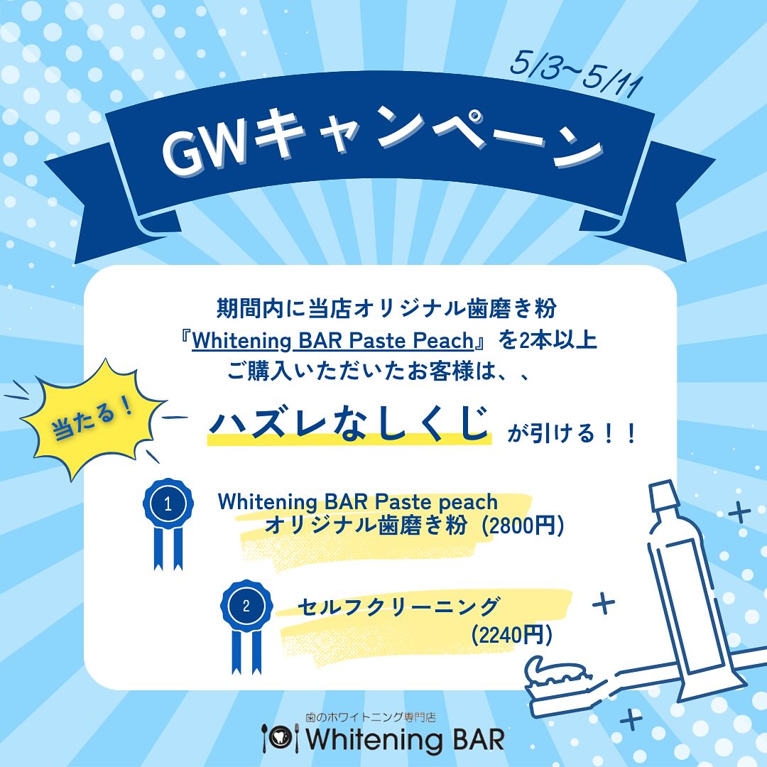 ︎ こんにちは! WhiteningBARアティ郡山店です🦷🤍 GWキャンペーン第2弾️ 5/3(土)〜5/11(日)の期間中に 当店オリジナル歯磨き粉『WhiteningBAR Paste Peach』を 2本同時購入していただきますと… セルフクリーニング or オリジナル歯磨き粉 どちらかが必ず当たる️ キャンペーンを実施中です!⋆⸜⸝⋆ 歯磨き粉を定期的に購入されている方も ご自宅で使ってみたい!という方も この機会に購入し、くじに挑戦してみてくださいね ——————————————— -—————————————— ホワイトニングバーアティ郡山店 〒963-8002 福島県郡山市駅前1丁目16-7 アティ郡山6階 TEL:024-954-5656 営業時間:10:00~20:00 ——————————————— ——————————————— #ホワイトニング #セルフホワイトニング #ホワイトニング福島 #ホワイトニング郡山 #アティ郡山 #歯のホワイトニング #ホワイトニングサロン #ホワイトニングバー #whiteningbar #白い歯 #痛くないホワイトニング #郡山市 #郡山駅 #郡山駅周辺 #美容 #自分磨き #メンズにも人気 #歯磨き粉 #ブライダル #カップル #友達同士 #当日予約OK #キャンペーン #リーズナブル #格安クーポン #施術効果 #施術写真
