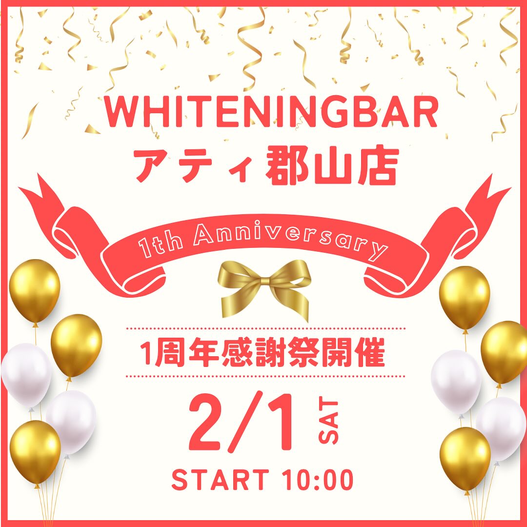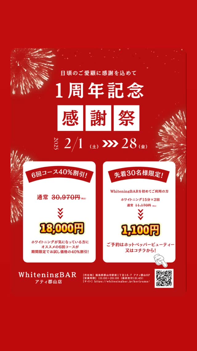 皆様にお知らせ- ̗̀ 💭 WhiteningBARアティ郡山店はおかげさまをもちまして 2月20日に1周年を迎えます️️ 無事に1周年を迎えることができますのもいつもご来店くださるお客様をはじめ、当店に関わる全ての皆様方のおかげで心より感謝しております。 誠にありがとうございます!!🏻♀️️ 感謝の気持ちを込めまして 2/1(土)〜2/28(金)の1ヶ月間、1周年感謝祭を開催いたします!! 感謝祭の内容は2つ!!️️ 1つ目は、先着30名様限定!ホワイトニング初回1,100円!!️ ホワイトニング2回連続ケア通常11,170円が1,100円で出来ちゃいます🫶🏻 こちらは先着30名様限定ですので達し次第終了となります️ 2つ目は、6回コースが18,000円に!!!️️ 6回コース通常30,970円が今月限定で18,000円でご提供!! ホワイトニングが気になっていた方や継続を考えていた方は このお得な機会をお見逃し無く! 来月も皆様のご来店心よりお待ちしております♀️❣️ ——————————————— -—————————————— ホワイトニングバーアティ郡山店 〒963-8002 福島県郡山市駅前1丁目16-7 アティ郡山6階 TEL:024-954-5656 営業時間:10:00~20:00 ——————————————— ——————————————— #ホワイトニング #セルフホワイトニング #ホワイトニング福島 #ホワイトニング郡山 #アティ郡山 #歯のホワイトニング #ホワイトニングサロン #ホワイトニングバー #whiteningbar #白い歯 #痛くないホワイトニング #郡山市 #郡山駅 #郡山駅周辺 #美容 #自分磨き #メンズにも人気 #歯磨き粉 #ブライダル #カップル #友達同士 #当日予約OK #キャンペーン #リーズナブル #格安クーポン #施術効果 #施術写真