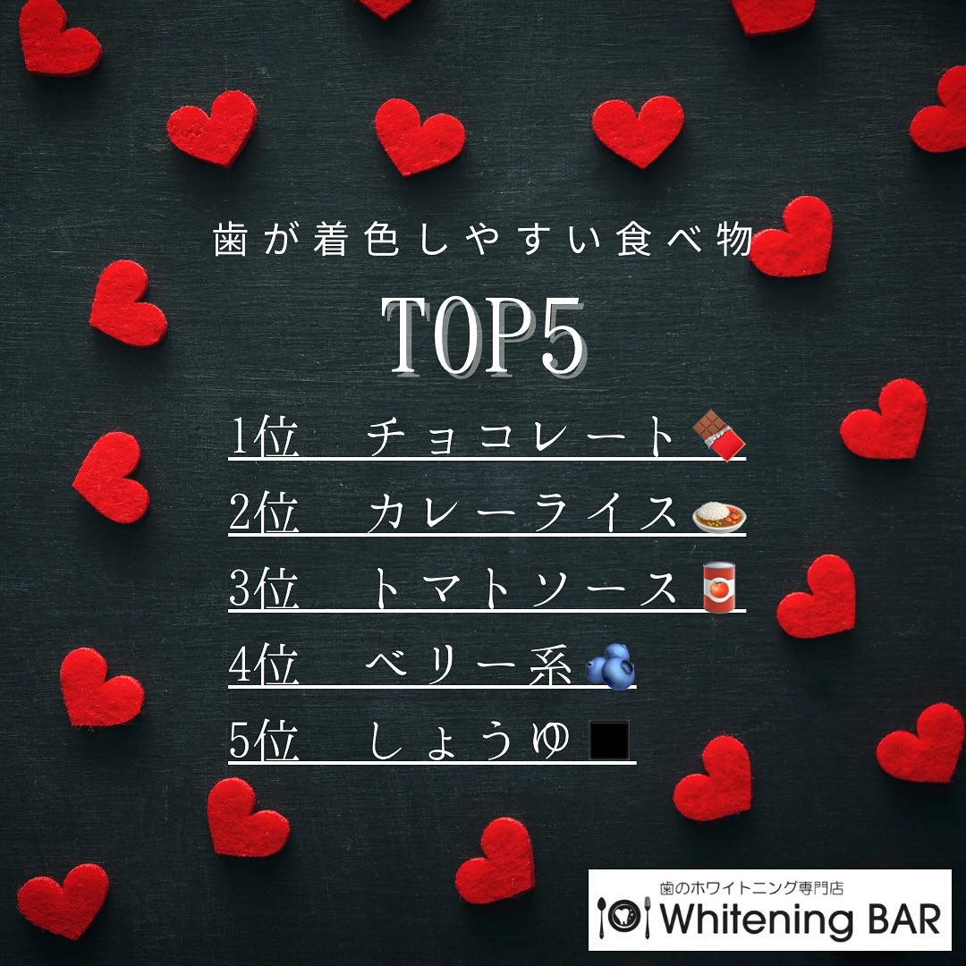︎ こんにちは!ホワイトニングバーアティ郡山店です🦷 本日は着色しやすい食べ物TOP5のご紹介です⌣̈🖐🏻 こちらのランキングTOP5は 特に着色しやすい食べ物だと言われておりますので 是非ご参考下さい!!ჱ̒՞ ̳ᴗ ̫ ᴗ ̳՞꒱ 1位:チョコレート →チョコレートに含まれる「カカオマス」「ポリフェノール」が着色汚れの原因となります! 抗酸化作用があるので美容目的に摂取する方も多いですが、食べ過ぎには特に注意が必要です。 2位:カレーライス →カレーに含まれる「ターメリック」和名でばウコンと呼ばれるスパイスで、”天然の着色料”として用いられています! カレーが黄色なのは、ほとんどターメリックによるものです。 3位:トマトソース🥫 →トマトは明るい赤色である上に”酸味”が強いため、トマトソースやケチャップなどは歯の着色汚れやエナメル質の破壊を促してしまう場合があります。 4位:ベリー糸🫐 →色が濃い上に”酸性度”が高く、着色の大きな原因となります!果汁は糖分を多く含むため、口内のバクテリアを増殖させ、歯の変色以外にもダメージを促進してしまう可能性があります。 5位:醤油️ →唾液に色がつきやすいものは、その唾液の色が歯に着色してしまいます。醤油だけでなく、色の濃い調味料の中には味噌やソースも該当されています! 着色の濃いものを食べた後はお口をゆすいだり、歯磨きを忘れずにしましょうね🪥 歯磨きで落としきれない着色汚れは、ホワイトニングバーにお任せ下さい ——————————————— ——————————————— ホワイトニングバーアティ郡山店 〒963-8002 福島県郡山市駅前1丁目16-7 アティ郡山6階 TEL:024-954-5656 営業時間:10:00〜20:00 ——————————————— ——————————————— #ホワイトニング #セルフホワイトニング #ホワイトニング福島 #ホワイトニング郡山 #アティ郡山 #歯のホワイトニング #ホワイトニングサロン #ホワイトニングバー #whiteningbar #白い歯 #痛くないホワイトニング #郡山市 #郡山駅 #郡山駅周辺 #美容 #自分磨き #メンズにも人気 #歯磨き粉 #ブライダル #カップル #友達同士 #当日予約OK #キャンペーン #リーズナブル #格安クーポン #施術効果 #施術写真