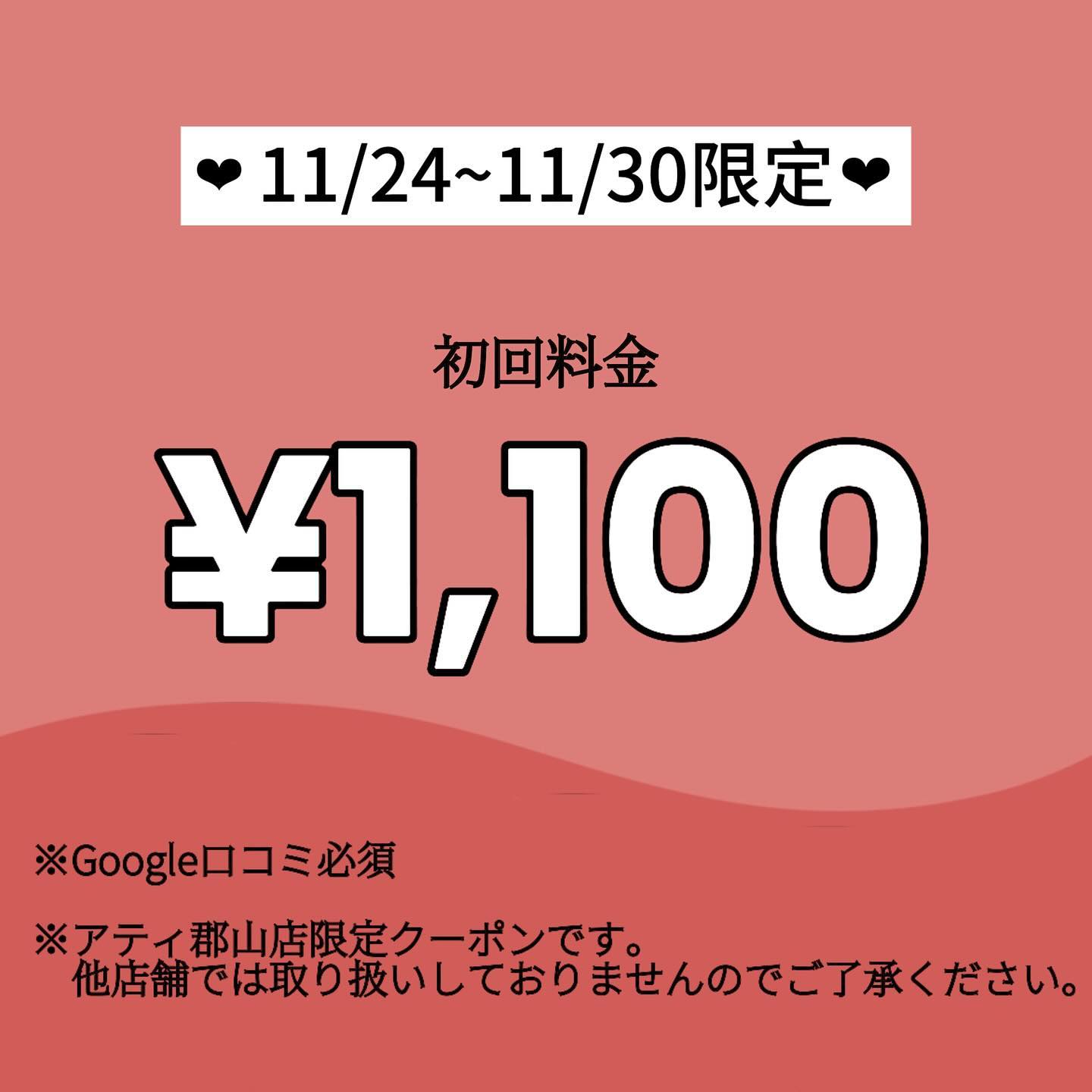 ︎ こんにちは! ホワイトニングバーアティ郡山店です🦷🤍 週替わりクーポン、ラストはこちら! 11/24(日)~11/30(土)の間に予約された方限定! 通常初回料金¥2,200が¥1,100!! こちらのクーポンはGoogleロコミが必須になります 是非お得な機会にホワイトニングを始めましょう⋆⸜⸝⋆ ※アティ郡山店限定クーポンです。他店舗では取り扱っておりませんのでご了承ください。 ——————————————— -—————————————— ホワイトニングバーアティ郡山店 〒963-8002 福島県郡山市駅前1丁目16-7 アティ郡山6階 TEL:024-954-5656 営業時間:10:00~20:00 ——————————————— ——————————————— #ホワイトニング #セルフホワイトニング #ホワイトニング福島 #ホワイトニング郡山 #アティ郡山 #歯のホワイトニング #ホワイトニングサロン #ホワイトニングバー #whiteningbar #白い歯 #痛くないホワイトニング #郡山市 #郡山駅 #郡山駅周辺 #美容 #自分磨き #メンズにも人気 #歯磨き粉 #ブライダル #カップル #友達同士 #当日予約OK #キャンペーン #リーズナブル #格安クーポン #施術効果 #施術写真
