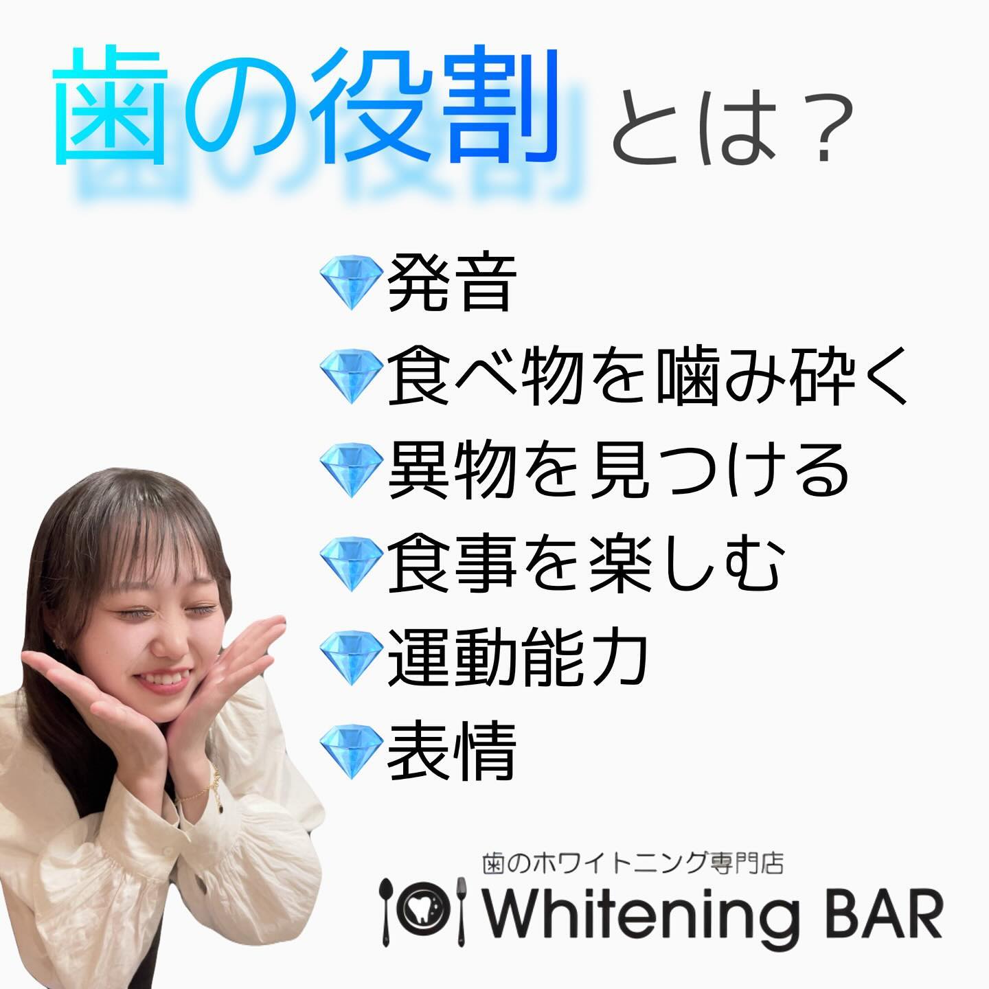︎ こんにちは!ホワイトニングバーアティ郡山店です🍽 本日は歯の役割についてです🦷 発音 歯がなくなると喋りづらくなります。舌や唇の動きを助ける役割もあります。 食べ物を噛み砕く 食べ物を細かく砕くことで栄養を吸収しやすくします。また、胃腸への負担も軽くなります。 異物を見つける 卵の殻など硬いもの(異物)を歯で噛んでしまい、吐き出した経験があるかと思いますが、そういった異物を排除する役割を果たしています。 食事を楽しむ “噛みごたえ”や”歯ざわり”などの言葉があるように、舌だけでなく歯からの感触も食事の楽しみの1つですよね♪ 運動能力 歯をしっかりと噛みしめることで体に力が入ります。 表情 歯並びや噛み合わせなどにより歯は内側から顔の形を支えています。 歯がなくなってしまうとシワやたるみの原因にもなり、笑顔をつくることが難しくなります。 歯の大切さは、歯を失ってからわかると言われます。 健康な体を支えるためにも歯は大切です🦷 その大切な歯を守るためにも歯の手入れに注意して、いつまでも自分の歯でかめるようにしましょう| 🕶)و ——————————————— ——————————————— ホワイトニングバーアティ郡山店 〒963-8002 福島県郡山市駅前1丁目16-7 アティ郡山6階 TEL:024-954-5656 営業時間:10:00〜20:00 ——————————————— ——————————————— #ホワイトニング #セルフホワイトニング #ホワイトニング福島 #ホワイトニング郡山 #アティ郡山 #歯のホワイトニング #ホワイトニングサロン #ホワイトニングバー #whiteningbar #白い歯 #痛くないホワイトニング #郡山市 #郡山駅 #郡山駅周辺 #美容 #自分磨き #メンズにも人気 #歯磨き粉 #ブライダル #カップル #友達同士 #当日予約OK #キャンペーン #リーズナブル #格安クーポン #施術効果 #施術写真