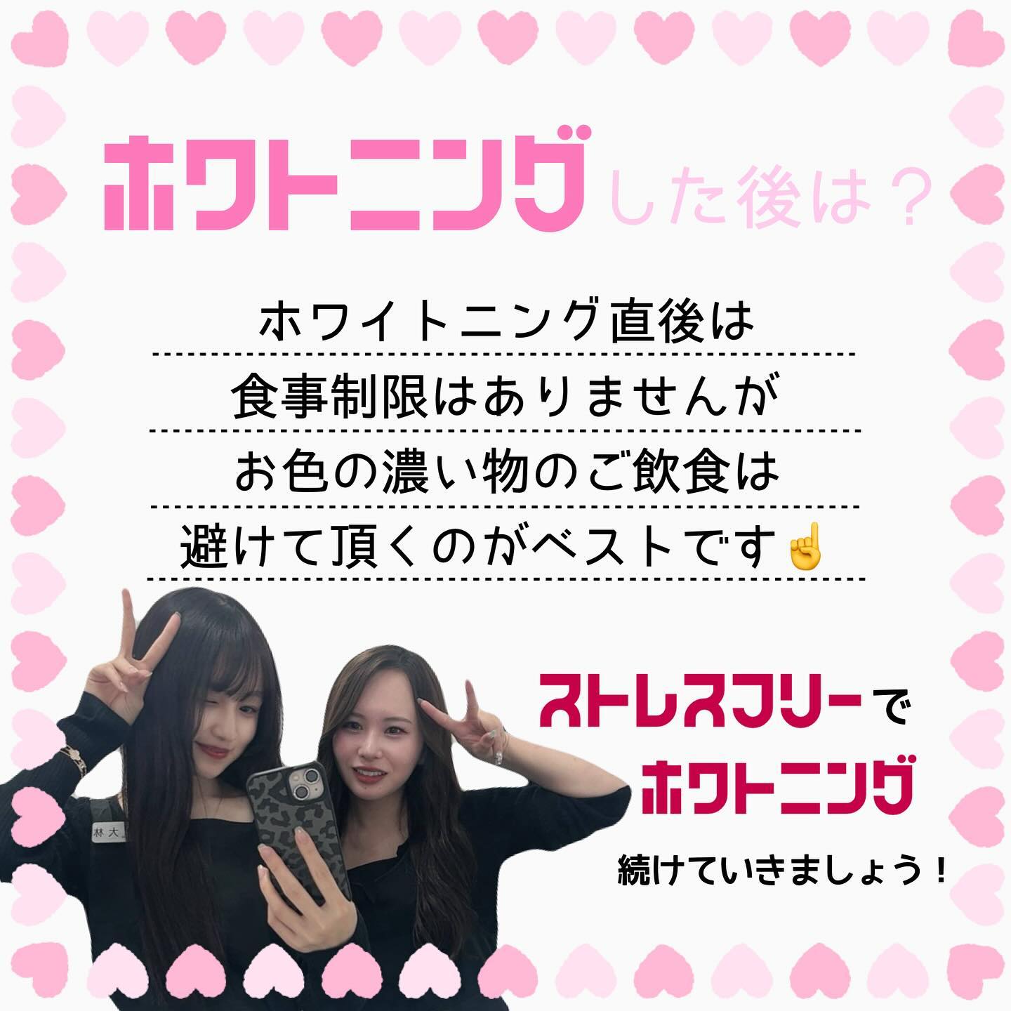 ︎ ホワイトニング後、食事はしてもいいですか? と質問を頂きますが、もちろんOKです🏻♀️ ですが、ホワイトニング後は歯が綺麗になっており、通常時よりとてもデリケートな為、お色の濃い飲食をされると色素を取り込みやすく、すぐに黄ばむ原因となります 出来る限りお色の濃いものを避けて頂くのがベストですが、日常的にコーヒー、紅茶、チョコレート、など日々好きだったものを急激に制限するとストレスになりますよね🥺 ストレスを溜めずにホワイトニングをしていく為に、飲食後の簡単なケアを気を付けていきましょう️❣️ ●早めにお水洗浄をする ●歯磨きをする ●外出先の場合はキシリトールガムを噛んで唾液を増やす…など (唾液はお口の中のリンスと言われているくらい洗浄効果があります🫧) 日常的に何か1つを気を付けるだけで黄ばみの原因は軽減させられます”ჱ̒(˶>ࠏ<˶グッ 是非実践してみてくださいね️ ——————————————— ——————————————— ホワイトニングバーアティ郡山店 〒963-8002 福島県郡山市駅前1丁目16-7 アティ郡山6階 TEL:024-954-5656 営業時間:10:00〜20:00 ——————————————— ——————————————— #ホワイトニング #セルフホワイトニング #ホワイトニング福島 #ホワイトニング郡山 #アティ郡山 #歯のホワイトニング #ホワイトニングサロン #ホワイトニングバー #whiteningbar #白い歯 #痛くないホワイトニング #郡山市 #郡山駅 #郡山駅周辺 #美容 #自分磨き #メンズにも人気 #歯磨き粉 #ブライダル #カップル #友達同士 #当日予約OK #キャンペーン #リーズナブル #格安クーポン #施術効果 #施術写真