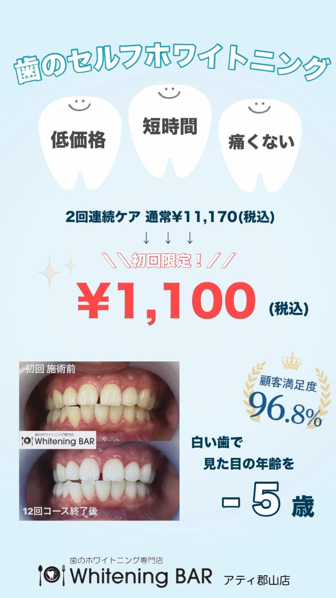 こんにちは! ホワイトニングバーアティ郡山店です🦷︎ ホワイトニングバーアティ郡山店では 初回限定価格1,100円でホワイトニングができちゃいます!️ 10,070円OFFと大変お得にご案内しております!!∑(Ꙭ こちらのキャンペーンは9月末までとなります! 「セルフホワイトニング」とは、お客さまご自身で施術していただく歯のホワイトニングです💭ྀི 普段の歯磨きでは落とせない着色汚れを落としていき、本来の歯の白さに戻すことが可能です♀️ ご予約は、 ◎ホットペッパービューティー ◎公式ホームページ ◎お電話 ◎インスタグラムDM から承っております! 皆様のご来店を心よりお待ちしております♀️ ——————————————— -—————————————— ホワイトニングバーアティ郡山店 〒963-8002 福島県郡山市駅前1丁目16-7 アティ郡山6階 TEL:024-954-5656 営業時間:10:00~20:00 ——————————————— ——————————————— #ホワイトニング #セルフホワイトニング #ホワイトニング福島 #ホワイトニング郡山 #アティ郡山 #歯のホワイトニング #ホワイトニングサロン #ホワイトニングバー #whiteningbar #白い歯 #痛くないホワイトニング #郡山市 #郡山駅 #郡山駅周辺 #美容 #自分磨き #メンズにも人気 #歯磨き粉 #ブライダル #カップル #友達同士 #当日予約OK #キャンペーン #リーズナブル #格安クーポン #施術効果 #施術写真