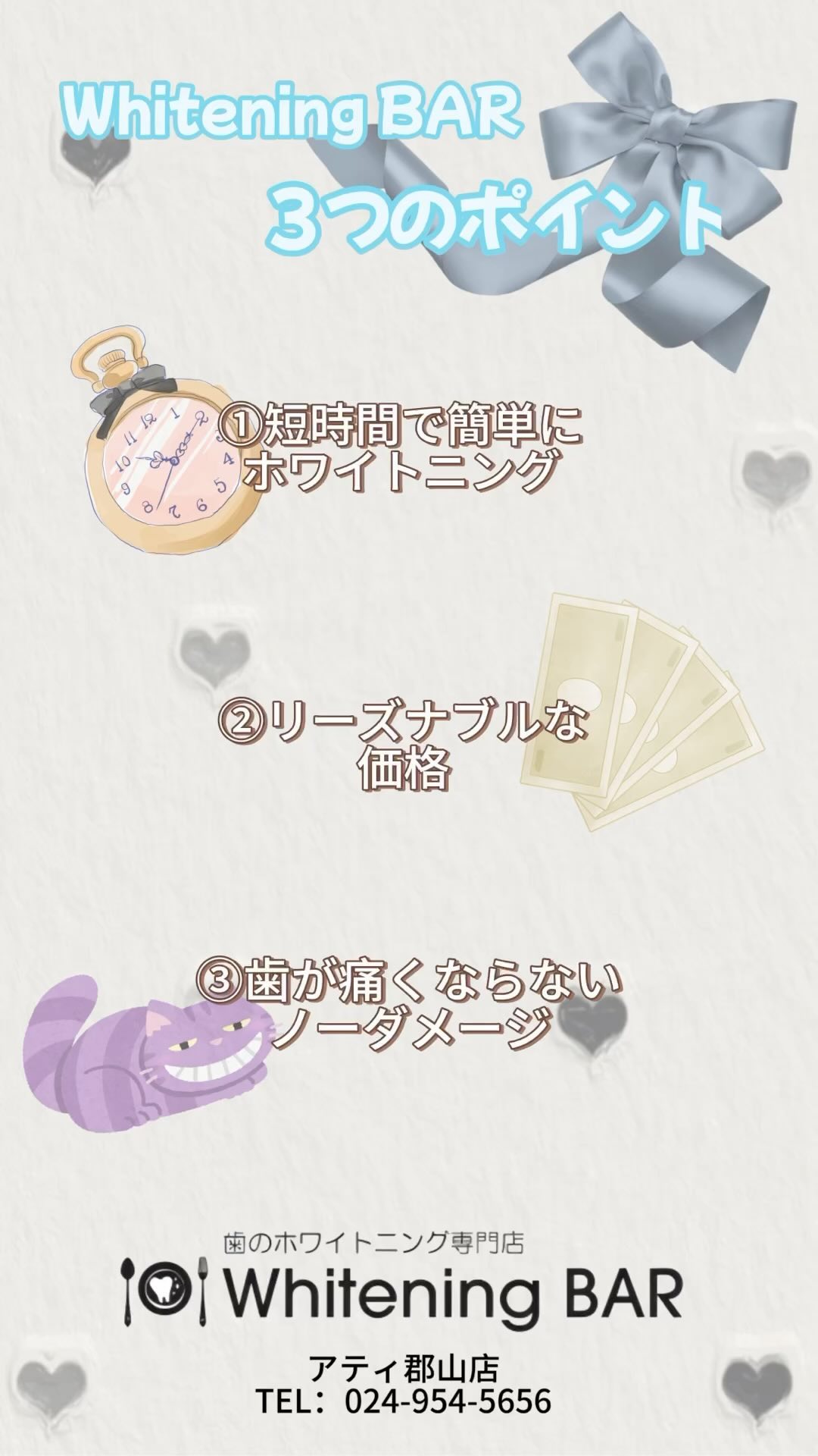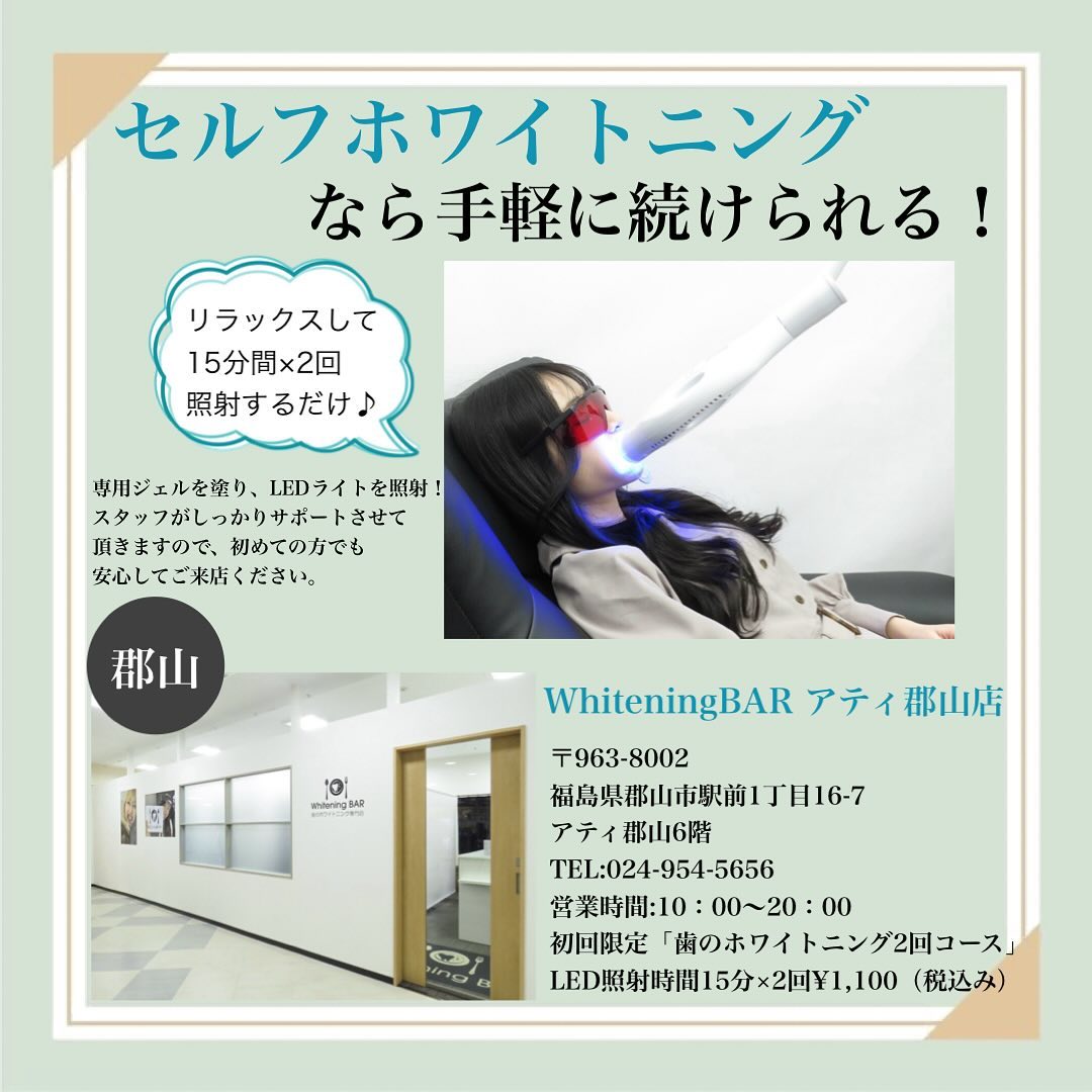 ︎ こんにちは! ホワイトニングバーアティ郡山店です🦷︎ WhiteningBARは簡単・痛くないがテーマ! 歯にダメージを与えず歯を本来の白さに導く、歯科医師と共同で開発した最新の歯のホワイトニングを提供しております♀️ そんなWhiteningBARの3つのポイントをご紹介いたします! ◎短時間で簡単にホワイトニング 初回はご説明を含めて1時間30分程お時間をいただきます! 2回目以降、2回連続ケアの場合の所要時間は約1時間程、歯磨きなどのケアの準備からジェルを塗布し、LED(15~20分)の光を照射をしていきます🤍 ご自身で納得いくお色になったら月1~2回のメンテナンスでOKです🏻 ◎リーズナブルな料金 料金は従来の方法に比べ、リーズナブルです! 本来の歯の白さを取り戻すことをより身近に感じて、無理なく続けていただけるようにわかりやすくお得な料金・コース設定になっております!️ ◎歯が痛くならないノーダメージ 店専用のジェルは、日本で認証工場で作られており、安心安全で歯にダメージを与えない最新技術を用いて作られています! 驚くほど歯が白くなるとお客様から高評価を得ています 是非当店のホワイトニングで効果を実感してみてください!⸜︎⸝ 皆様のご来店心よりお待ちしております! ——————————————— -—————————————— ホワイトニングバーアティ郡山店 〒963-8002 福島県郡山市駅前1丁目16-7 アティ郡山6階 TEL:024-954-5656 営業時間:10:00~20:00 ——————————————— ——————————————— #ホワイトニング #セルフホワイトニング #ホワイトニング福島 #ホワイトニング郡山 #アティ郡山 #歯のホワイトニング #ホワイトニングサロン #ホワイトニングバー #whiteningbar #白い歯 #痛くないホワイトニング #郡山市 #郡山駅 #郡山駅周辺 #美容 #自分磨き #メンズにも人気 #歯磨き粉 #ブライダル #カップル #友達同士 #当日予約OK #キャンペーン #リーズナブル #格安クーポン #施術効果 #施術写真