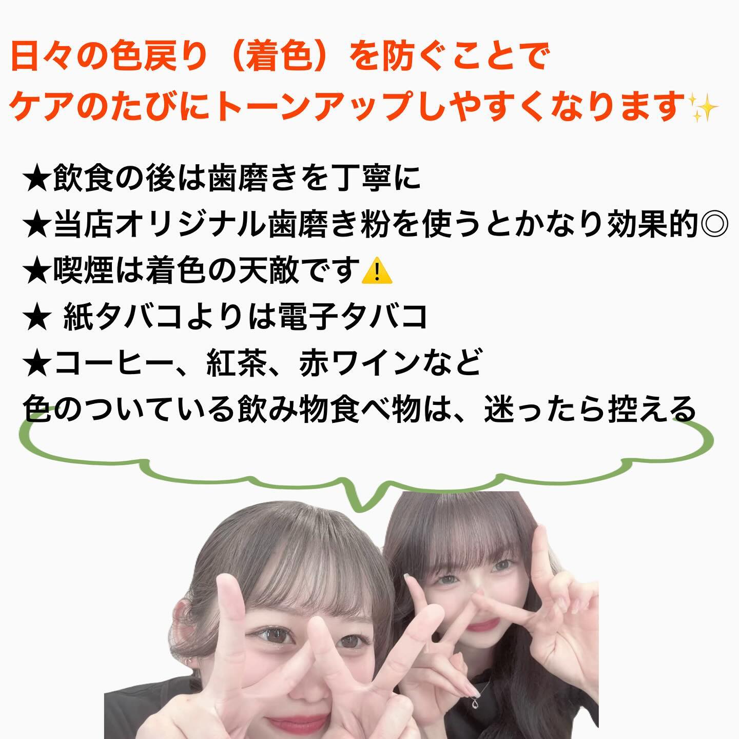 ︎ こんにちはᐠ( ᐛ )ᐟホワイトニングバーアティ郡山店です! 歯が黄ばむ原因は主に飲食物とタバコのヤニと言われています。 色の濃い飲食物で代表的なのがコーヒー、紅茶、緑茶、コーラなど。 また、日常的に摂取することが多い醤油、ソース、ケチャップなどの調味料も着色しやすい食品です。 どの料理にも使われるような調味料ばかりで、摂取しないというのはなかなか難しいです そこで、着色の濃い飲食物を摂取した後には着色を防ぐために、口を水でゆすいだり、食後30分後の歯磨きを心掛けましよう🦷 ホワイトニング後も着色しやすい状態になっているため、少しでも綺麗になったお色をキープできるよう、参考に生活してみてくださいね🥹🫶🏻️ ——————————————— ——————————————— ホワイトニングバーアティ郡山店 〒963-8002 福島県郡山市駅前1丁目16-7 アティ郡山6階 TEL:024-954-5656 営業時間:10:00〜20:00 ——————————————— ——————————————— #ホワイトニング #セルフホワイトニング #ホワイトニング福島 #ホワイトニング郡山 #アティ郡山 #歯のホワイトニング #ホワイトニングサロン #ホワイトニングバー #whiteningbar #白い歯 #痛くないホワイトニング #郡山市 #郡山駅 #郡山駅周辺 #美容 #自分磨き #メンズにも人気 #歯磨き粉 #ブライダル #カップル #友達同士 #当日予約OK #キャンペーン #リーズナブル #格安クーポン #施術効果 #施術写真