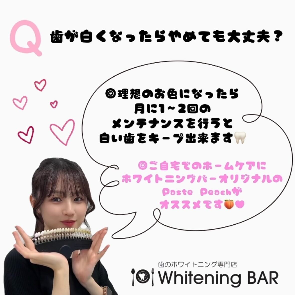 ︎ ホワイトニングは永久的なものではないので 明るさをキープするにはメンテナンスが必要です️ スタッフも全員、定期的に月1~2回メンテナンスをしております🦷 店長は大好きなコーヒーを1日1回は必ず飲みますし、色の濃い料理も大好きですが、月に1回のホワイトニングのおかげで綺麗な永久歯の色をキープ出来ています 自宅ではホワイトニングバーオリジナルのPaste Peach🪥を使ってホームケアも欠かせません🏻︎ ——————————————— ——————————————— ホワイトニングバーアティ郡山店 〒963-8002 福島県郡山市駅前1丁目16-7 アティ郡山6階 TEL:024-954-5656 営業時間:10:00〜20:00 ——————————————— ——————————————— #ホワイトニング #セルフホワイトニング #ホワイトニング福島 #ホワイトニング郡山 #アティ郡山 #歯のホワイトニング #ホワイトニングサロン #ホワイトニングバー #whiteningbar #白い歯 #痛くないホワイトニング #郡山市 #郡山駅 #郡山駅周辺 #美容 #自分磨き #メンズにも人気 #歯磨き粉 #ブライダル #カップル #友達同士 #当日予約OK #キャンペーン #リーズナブル #格安クーポン #施術効果 #施術写真