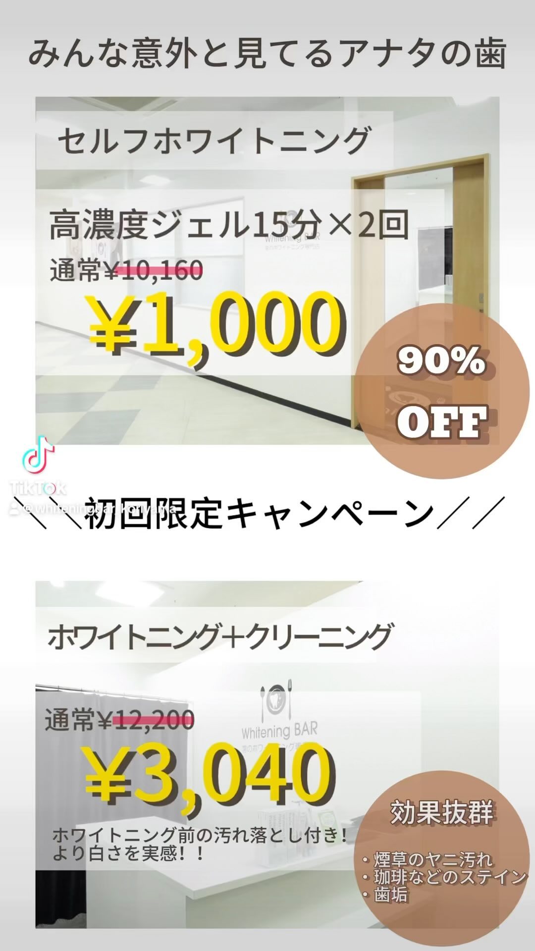 ︎ 当店では、初めてご来店頂くお客様限定! 初回価格¥1,000でホワイトニングをお試し頂けます🕊 ͗ ͗︎︎♡ (※初回価格は変更になる場合がございます) LEDライト15分照射を2回連続でケア️ 通常価格は¥10,160ですので、¥9,160もお得に🏻 ̖́- ホワイトニングにご興味がある方! 年間約8万人のお客様にご来店頂く “WhiteningBAR”でぜひ体験してみませんか? 初めてご来店頂くお客様は、 ご説明とカウンセリングをさせて頂きますので 1時間30分〜1時間45分程お時間を頂戴しております また、口コミを投稿頂いたお客様には豪華特典がございます 皆様のご予約・ご来店を心よりお待ちしております(๑ ᷇ 𖥦 ᷆๑)♡ ゎ‹ゎ‹ ——————————————— ——————————————— ホワイトニングバーアティ郡山店 〒963-8002 福島県郡山市駅前1丁目16-7 アティ郡山6階 TEL:024-954-5656 営業時間:10:00〜20:00 ——————————————— ——————————————— #ホワイトニング #セルフホワイトニング #ホワイトニング福島 #ホワイトニング郡山 #アティ郡山 #歯のホワイトニング #ホワイトニングサロン #ホワイトニングバー #whiteningbar #白い歯 #痛くないホワイトニング #郡山市 #郡山駅 #郡山駅周辺 #美容 #自分磨き #メンズにも人気 #歯磨き粉 #ブライダル #カップル #友達同士 #当日予約OK #キャンペーン #リーズナブル #格安クーポン #施術効果 #施術写真