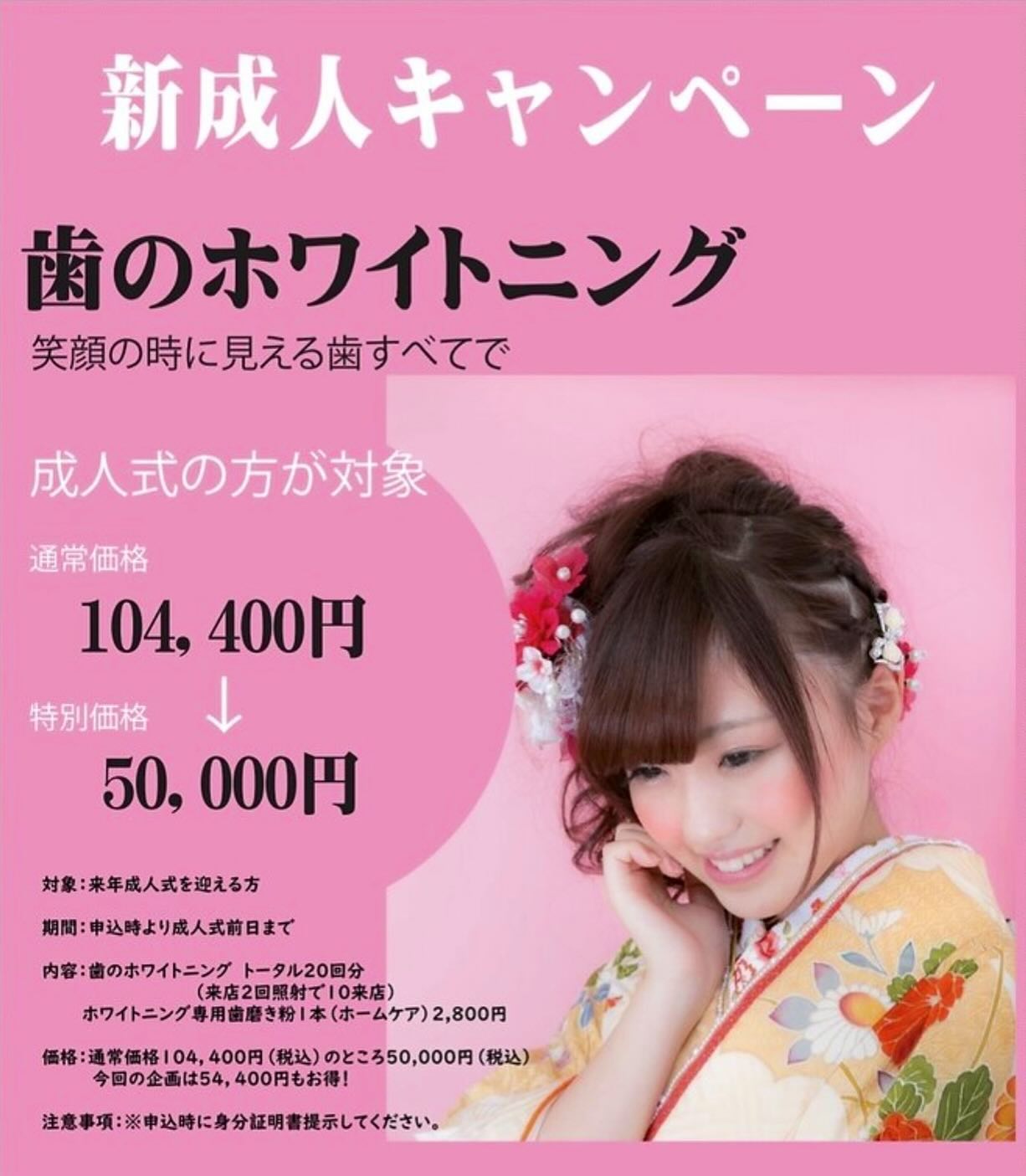 ︎ 来年2025年 成人式を迎える方へ❣️ とっっっても!お得なキャンペーンをご用意しております 新成人キャンペーンの内容は ●照射20回(2回連続照射来店で10回) ●ホワイトニング専用歯磨き粉(120g、2,800円) がついて通常104,400円のところ…. 50,000円(税込)️でご案内しております〜🦖 地方によって開催日が違うと思うので日にちに合わせて 短期集中でケアを重ねるのがオススメです 一生に一度の20歳の大イベントに白い歯を手に入れてください🦷🪄︎︎ ——————————————– ——————————————– ホワイトニングバーアティ郡山店 〒963-8002 福島県郡山市駅前1丁目16-7 アティ郡山6階 TEL:024-954-5656 営業時間:10:00〜20:00 ——————————————– ——————————————– #ホワイトニング #セルフホワイトニング #ホワイトニング福島 #ホワイトニング郡山 #アティ郡山 #歯のホワイトニング #ホワイトニングサロン #ホワイトニングバー #whiteningbar #白い歯 #痛くないホワイトニング #郡山市 #郡山駅 #郡山駅周辺 #美容 #自分磨き #メンズにも人気 #歯磨き粉 #ブライダル #カップル #友達同士 #当日予約OK #キャンペーン #リーズナブル #格安クーポン #施術効果 #施術写真