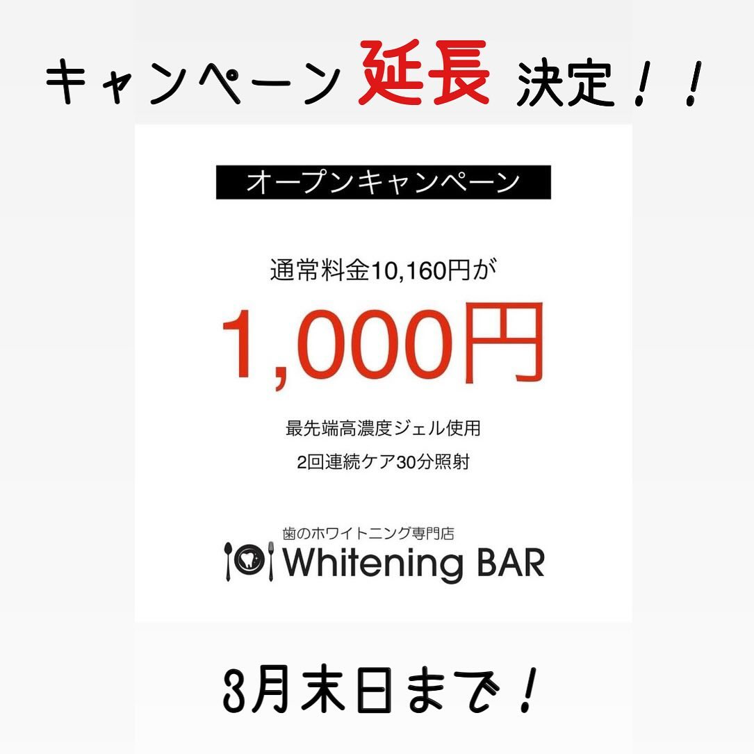 ︎ こんにちは、ホワイトニングバーアティ郡山店です! 2月20日にオープンを迎え、初日から沢山の方にご来店いただき大変嬉しく思います オープンを記念しまして、2月中ご来店されたご新規様は1,000円でホワイトニングができちゃうキャンペーンを行っておりました!( 通常ご新規様4,160円 ) なんと、こちらのキャンペーン…… ご好評につき! 3月末までの延長が決定いたしました!!️ 2月中都合が合わず来られなかった方や気になっていた方、是非このお得すぎる機会に一緒に白い歯を目指しませんか?️ ご予約方法は、 ・公式ホームページ ・ホットペッパービューティー 24時間いつでもご予約承り中です!🫶🏻 「ホワイトニングバー郡山店」 で検索をお願いいたします♀️🤍 皆様のご来店心よりお待ちしております𓂃🫧 ホワイトニングバーアティ郡山店 住所:福島県郡山市駅前1-16-7 アティ6F TEL:024-954-5656