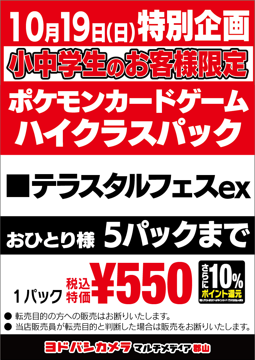 【ポケモンカード特別企画】 地下1階おもちゃ売場にて 10/19(日)小中学生を対象に ハイクラスパック『#テラスタルフェス』を 先着順にて販売いたします。 お1人様5パックまでの販売とさせていただきます。 ぜひお越しください💁 🏬