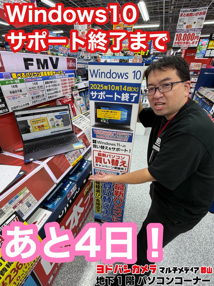 Windows10サポート終了 大商談会📣 Windows10サポート終了まであと4日… セキュリティ対策や快適な動作のために、 今が買い替えのチャンス✨ 店頭では専門スタッフが最適な パソコン選びをサポートします🎵 ➡
