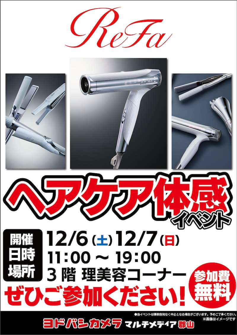 / 本日19時まで開催📣 ReFa ヘアケア体感イベント \ 人気のヘアドライヤーや ヘアアイロンをずらりとご用意🎵 参加費はもちろん無料✨ ぜひお越しください💁