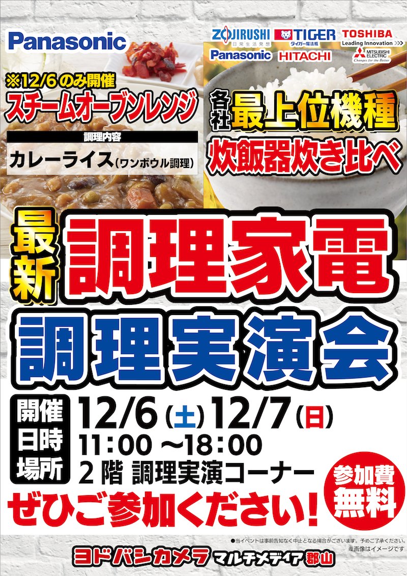/ 本日より開催 週末イベント情報📣 \ 各メーカー最上位機種の炊飯器を使ったお米の炊き比べ 実演。 12月6日(土)限定でパナソニックのスチームオーブンレンジを使った、カレーの調理調理も行います😊 どちらもご試食可能なイベントになりますので、お立ち寄りください‼️