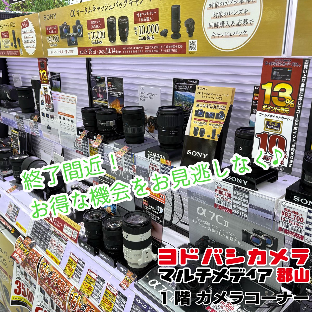 【☆終了間近☆】 ヨドバシ郡山1階カメラコーナーでは、ソニー製品を対象にキャッシュバックキャンペーンを実施中です✨ 対象製品のご購入&ご応募で、最大40,000円のキャッシュバック🎵 10/14までのご購入分が対象となりますので、ぜひお早めに❗️ ➡