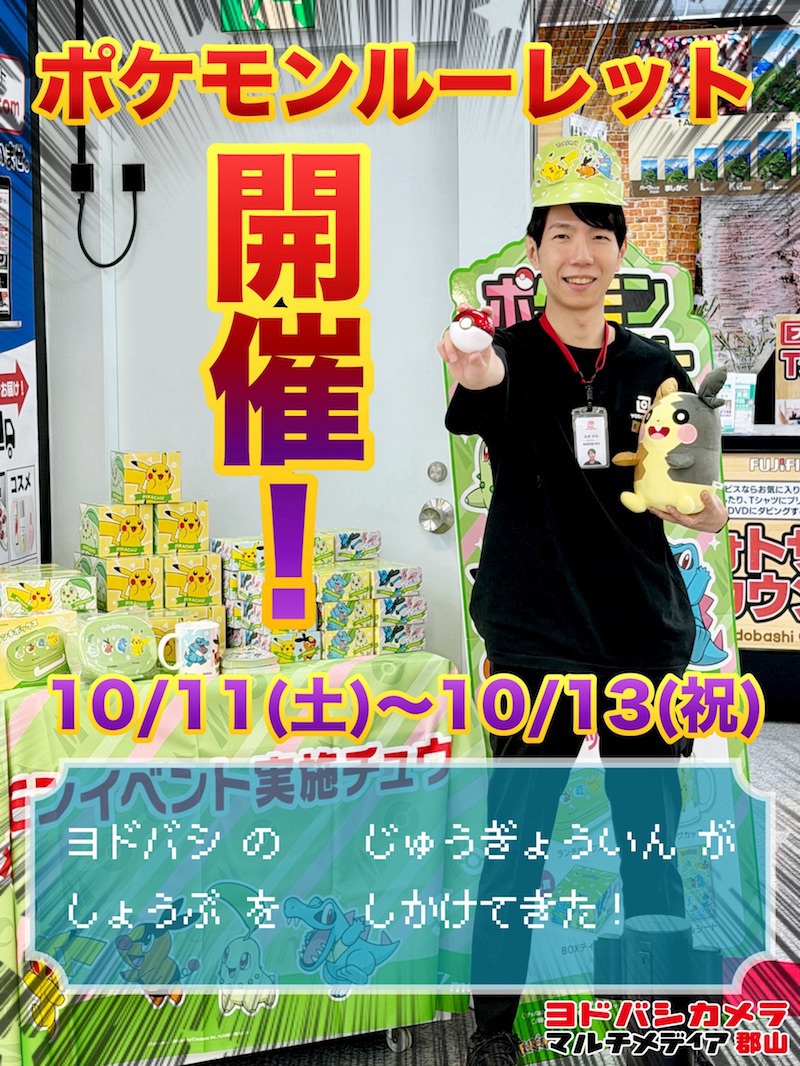 📣ポケモンルーレット開催のご案内 ランチボックスやマグカップなど 日常で使えるポケモングッズをゲットしよう❗️ どなた様でも無料でご参加できます ※景品が無くなり次第終了となります🙇 🗓️10/11(土)~13(月) 🕙11:00~18:00 📍1階 出入口前特設会場 ➡️