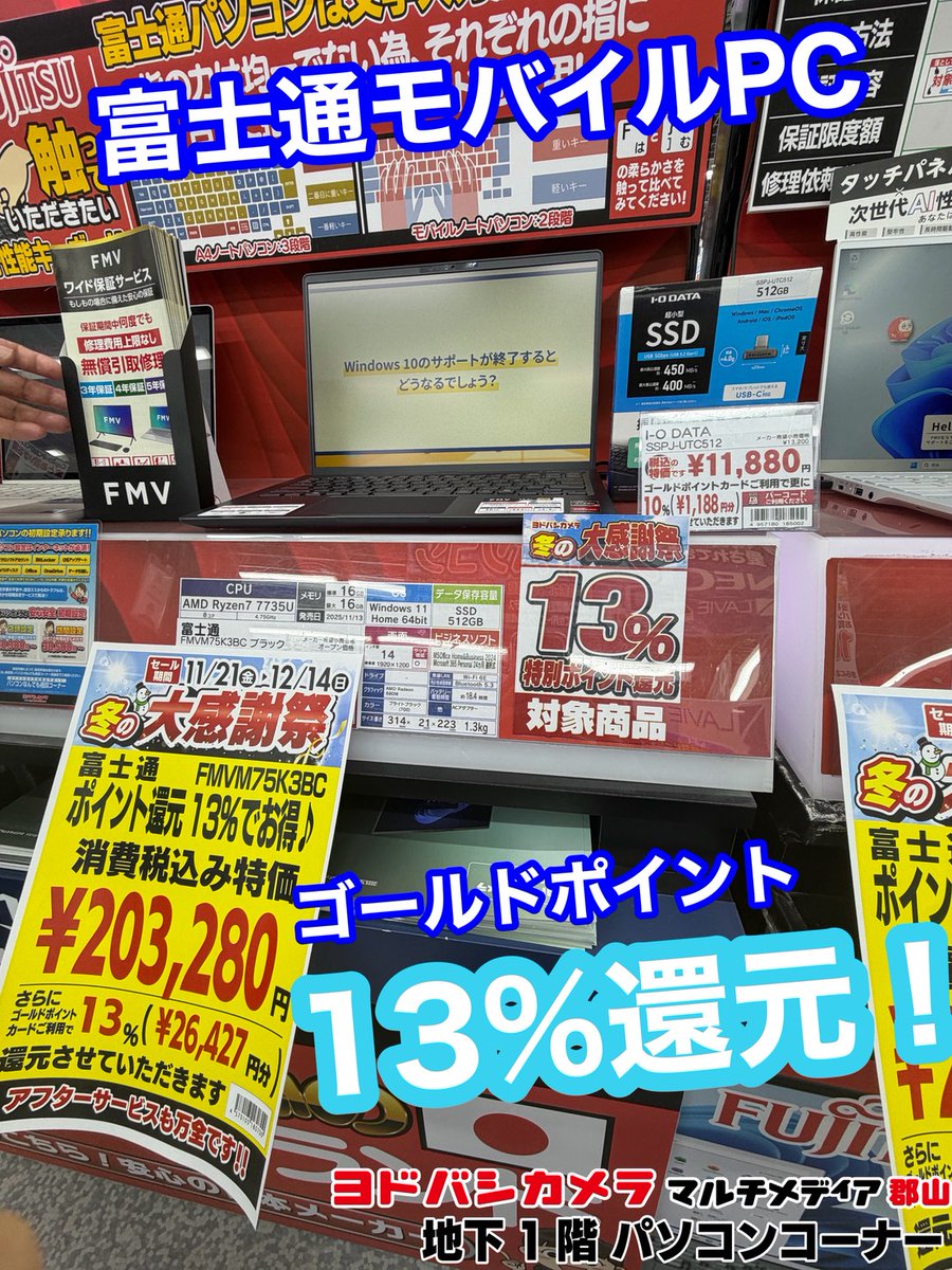 冬の大感謝祭、開催中‼️ 富士通の対象モバイルPCが 12/14(日)までポイント13%特別還元👍 さらに貯まったポイントで アイオーデータのSSD「SSPJシリーズ」もお得にゲット❗️ 店頭では他にもお買い得商品を多数ご用意✨ 週末のお買い物はぜひヨドバシカメラへ🎵 ➡
