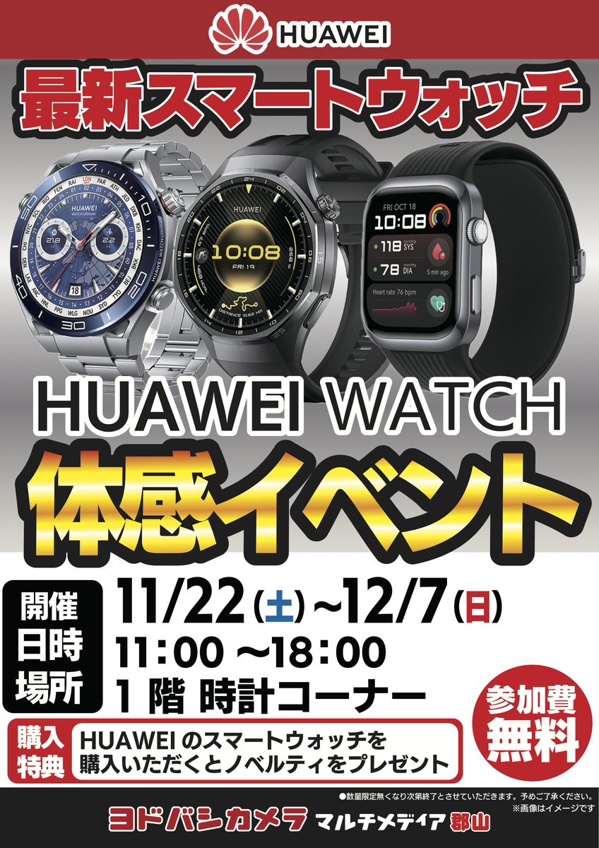 【本日も開催❗️】 HUAWEIの最新スマートウォッチ体感イベント 気軽に、血圧測定ができるモデルをご用意しております。 ご購入いただいた方には先着でノベルティをプレゼント🎁 参加費は無料。お気軽にご参加ください💁 🗓️11/22(土)~12/7(日) 🕙各日11:00~18:00