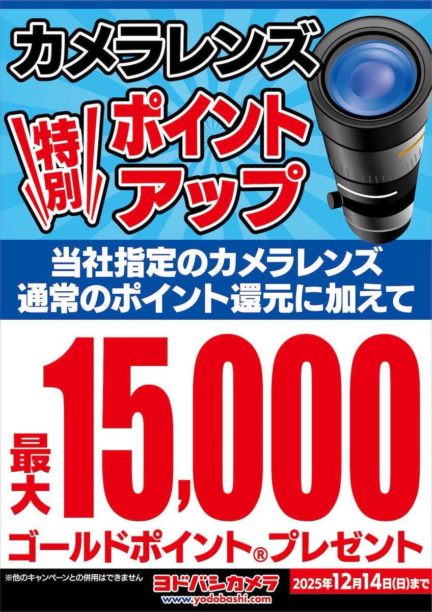 【☆ポイントアップ開催中☆】 カメラコーナーではカメラレンズのポイントアップキャンペーンを開催中✨ 当社指定のレンズをご購入いただきますと、通常のポイント還元と併せて最大15000ポイントをプレゼント🎁 お得なこの機会をぜひお見逃しなく👀 ➡