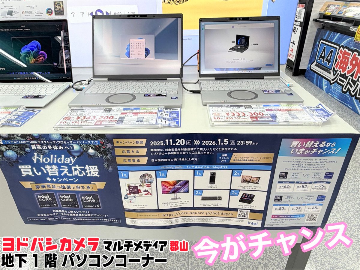 【Intel Core Ultra祭り開催中♪】 Intel Core Ultra搭載PCをご購入で 豪華賞品が当たるキャンペーン実施中❗️ 対象のLet’s noteがキャンペーン対象に❗️ ぜひヨドバシ郡山でご確認ください♪ ➡️ #インテルCPU #インテルホリデーキャンペーン