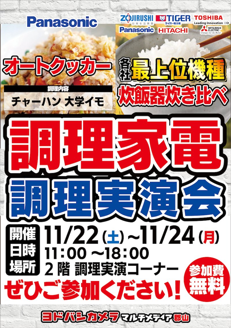 / パナソニック調理実演会& 炊飯器炊き比べ会開催 \ オーブンレンジとオートクッカーを使って チャーハンや大学芋の実演を行います✨ 同時に各メーカーの最上位機種 炊飯器を使い炊き比べも行います🎵 🗓11/22(土)~11/24(月) 🕙11時~18時 📍2階調理家電コーナー 🏬