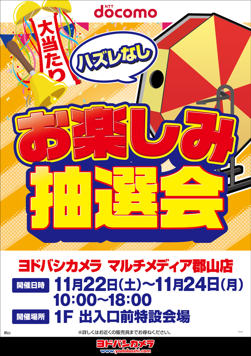 / ガラポン抽選会開催📣 \ 巨大ガラポンイベントを開催します✨ 無料で誰でも参加可能👍 当店にお立ち寄りの際は ぜひご参加ください🎵 🗓11/22(土)~11/24(月) 🕙10:00~18:00 📍1階出入口前特設会場 🏬