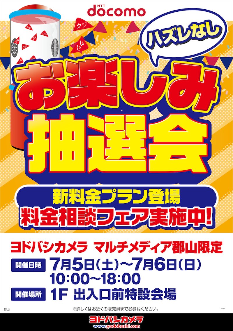 / お楽しみ抽選会& ドコモ料金相談フェアご案内 \ ハズレなし!お楽しみ抽選会を開催✨ また、ドコモ新料金プランのご説明や 料金相談フェアも同時開催中です🎵 ぜひお越しください 🗓7/5(土)7/6(日) 🕙10:00~18:00 📍1階 出入口前特設会場 ➡yodobashi.com/ec/news/200009…